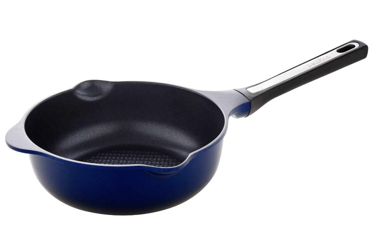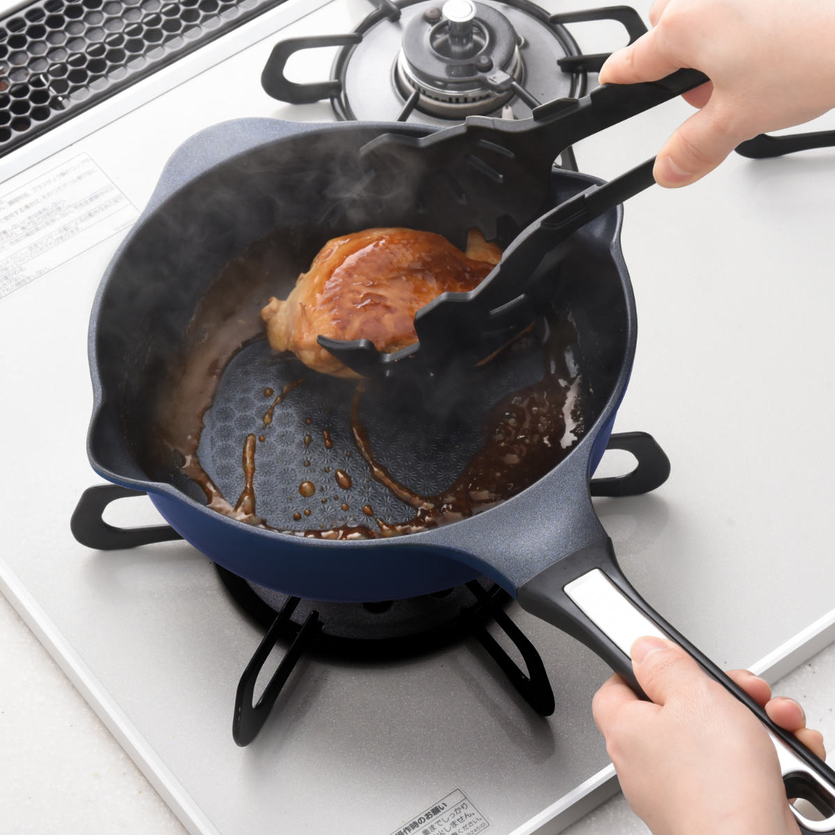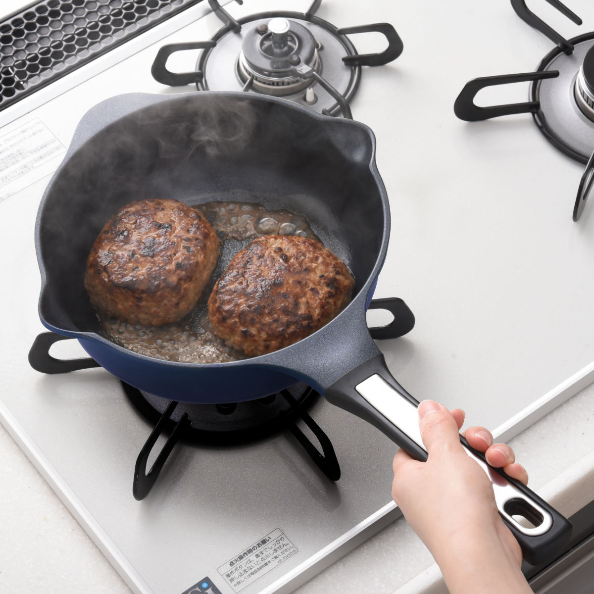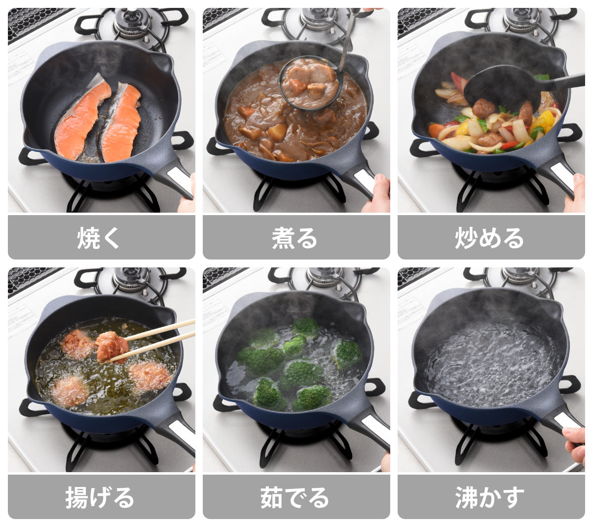 「焼く」「煮る」「炒める」「揚げる」「茹でる」「沸かす」の6役をこなすフライパンです。底面はしっかりと肉厚を持たせて熱を均一に伝えつつ、側面の余分な厚みを抑えることで、軽さと使いやすさを両立しています。