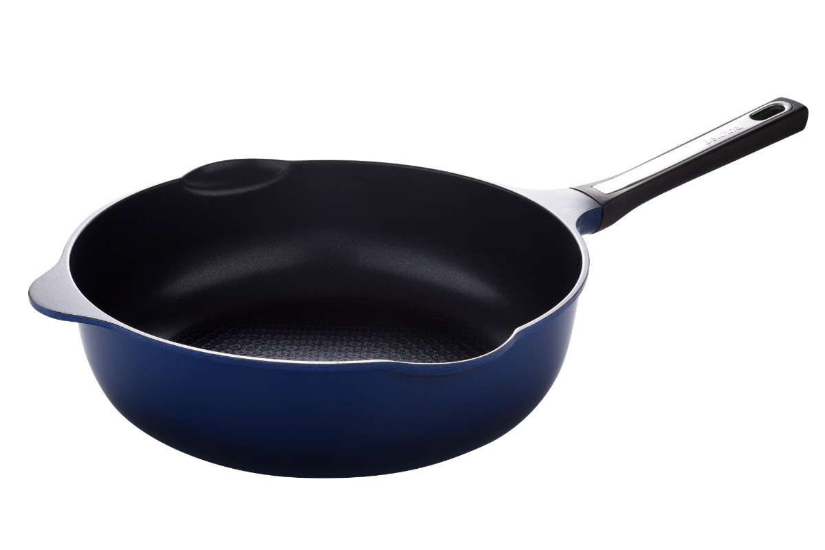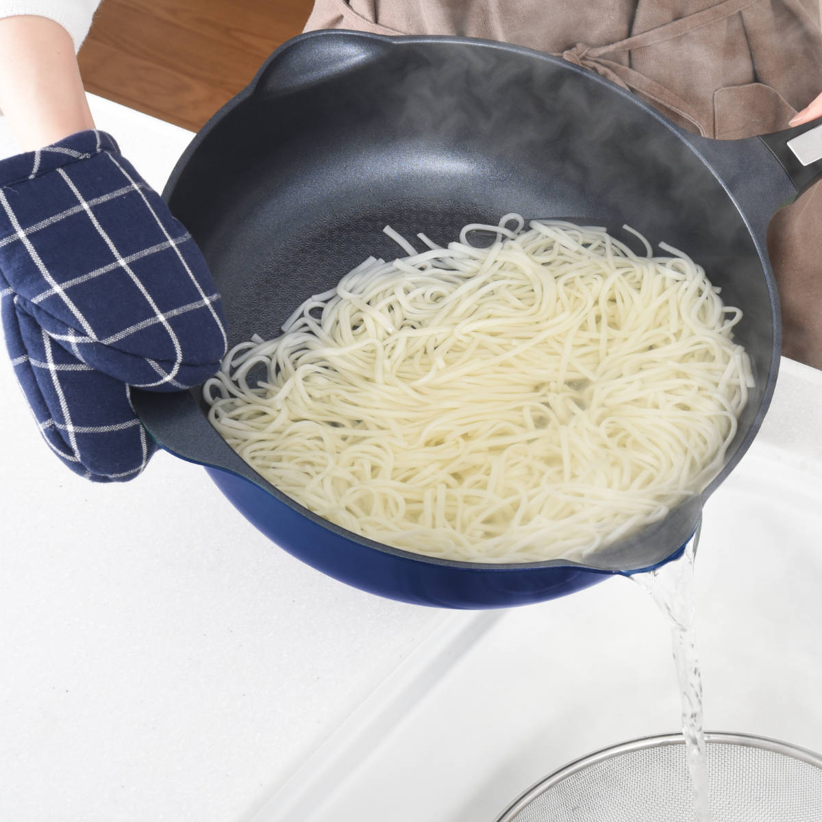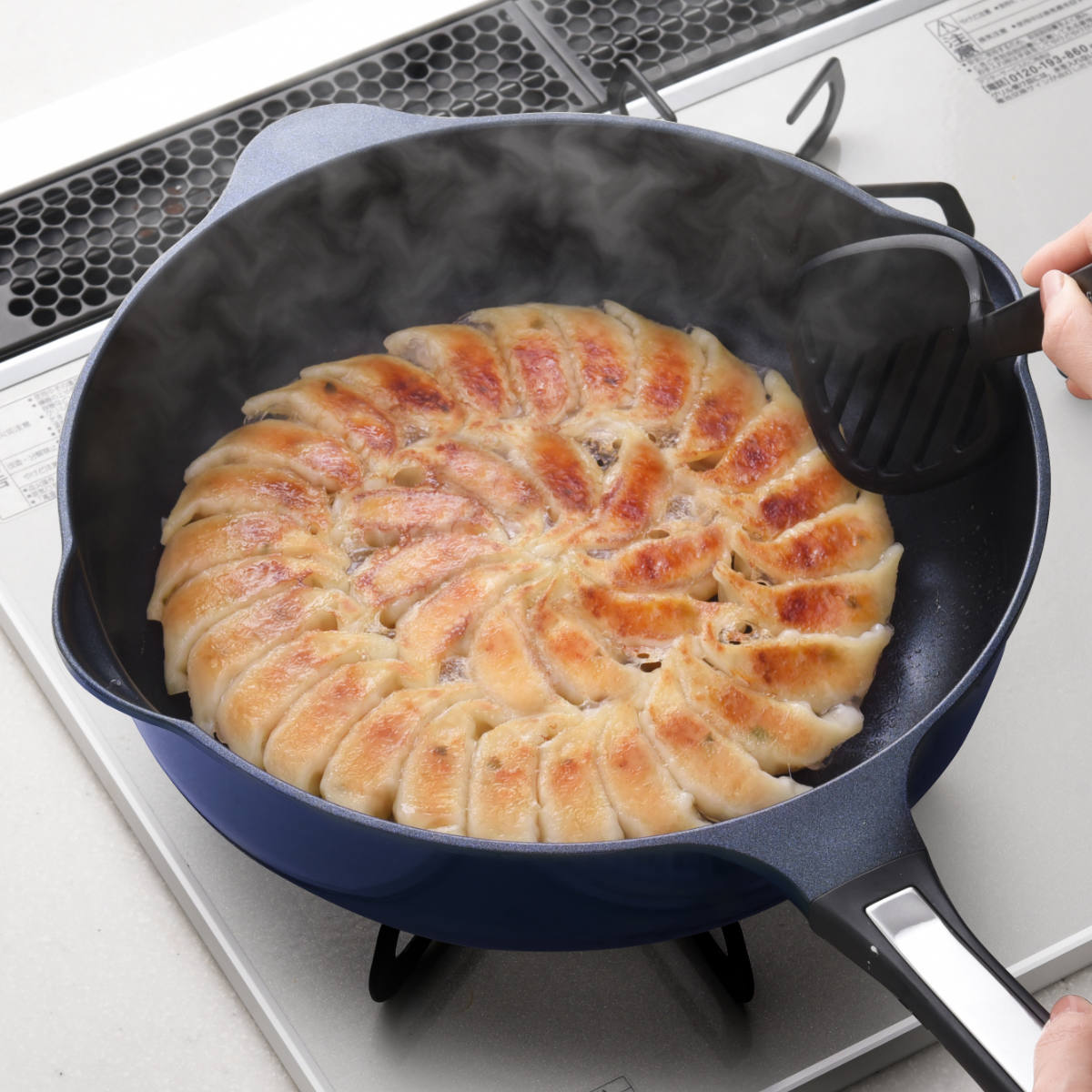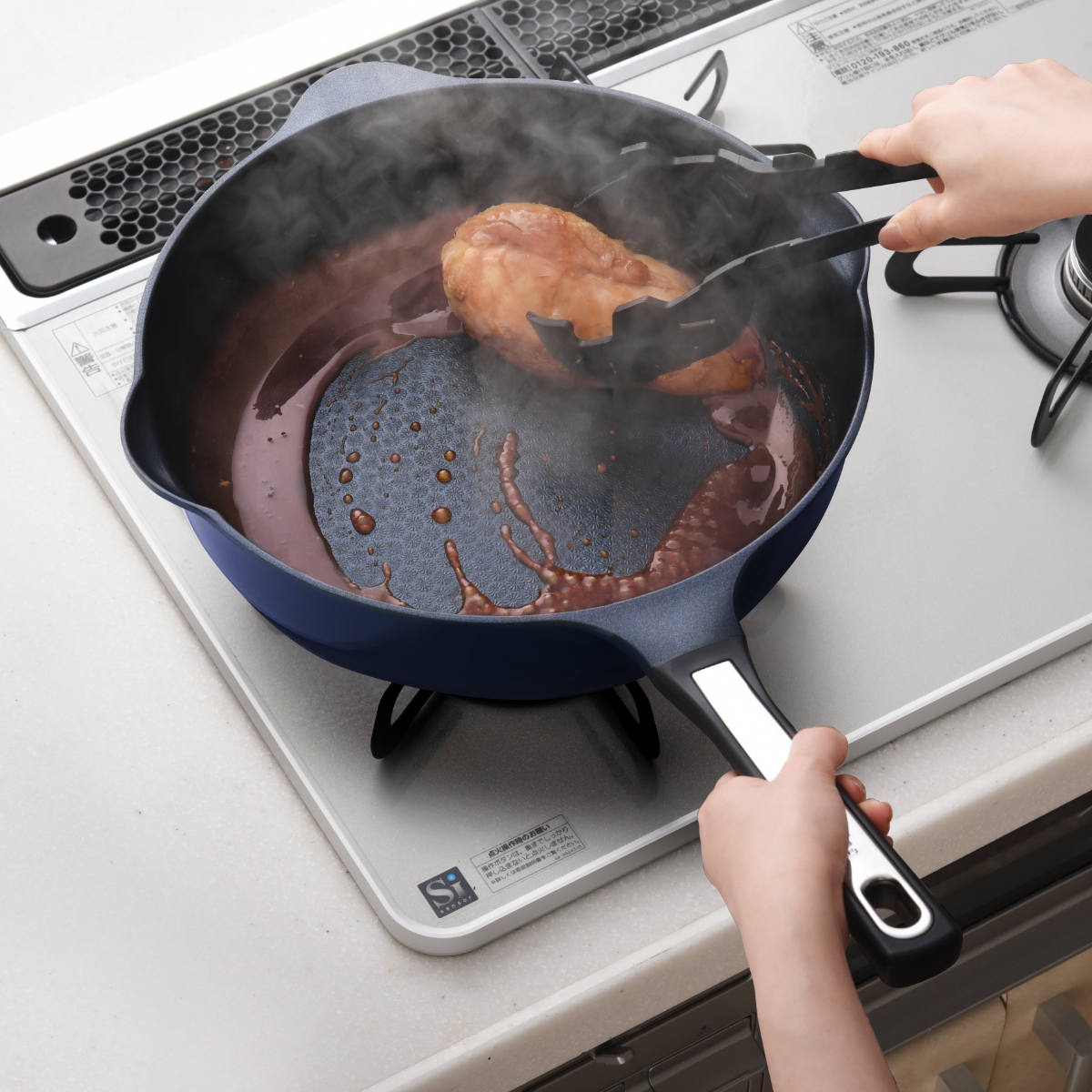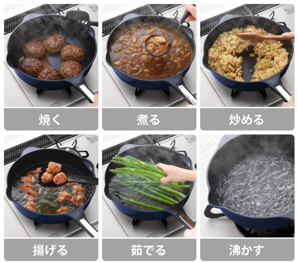 「焼く」「煮る」「炒める」「揚げる」「茹でる」「沸かす」の6役をこなすフライパンです。底面はしっかりと肉厚を持たせて熱を均一に伝えつつ、側面の余分な厚みを抑えることで、軽さと使いやすさを両立しています。
