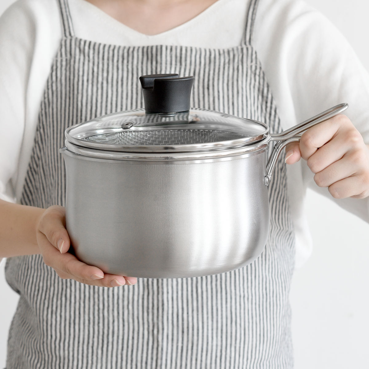 コンパクトでスタイリッシュな蓋・ストレーナー付きステンレスポットです。「煮る」「沸かす」「茹でる」「炒める」「炊く」「揚げる」「和える」「保存」「蒸す」の9役をこなします。大きすぎないので使いやすく、毎日の調理に活躍します。