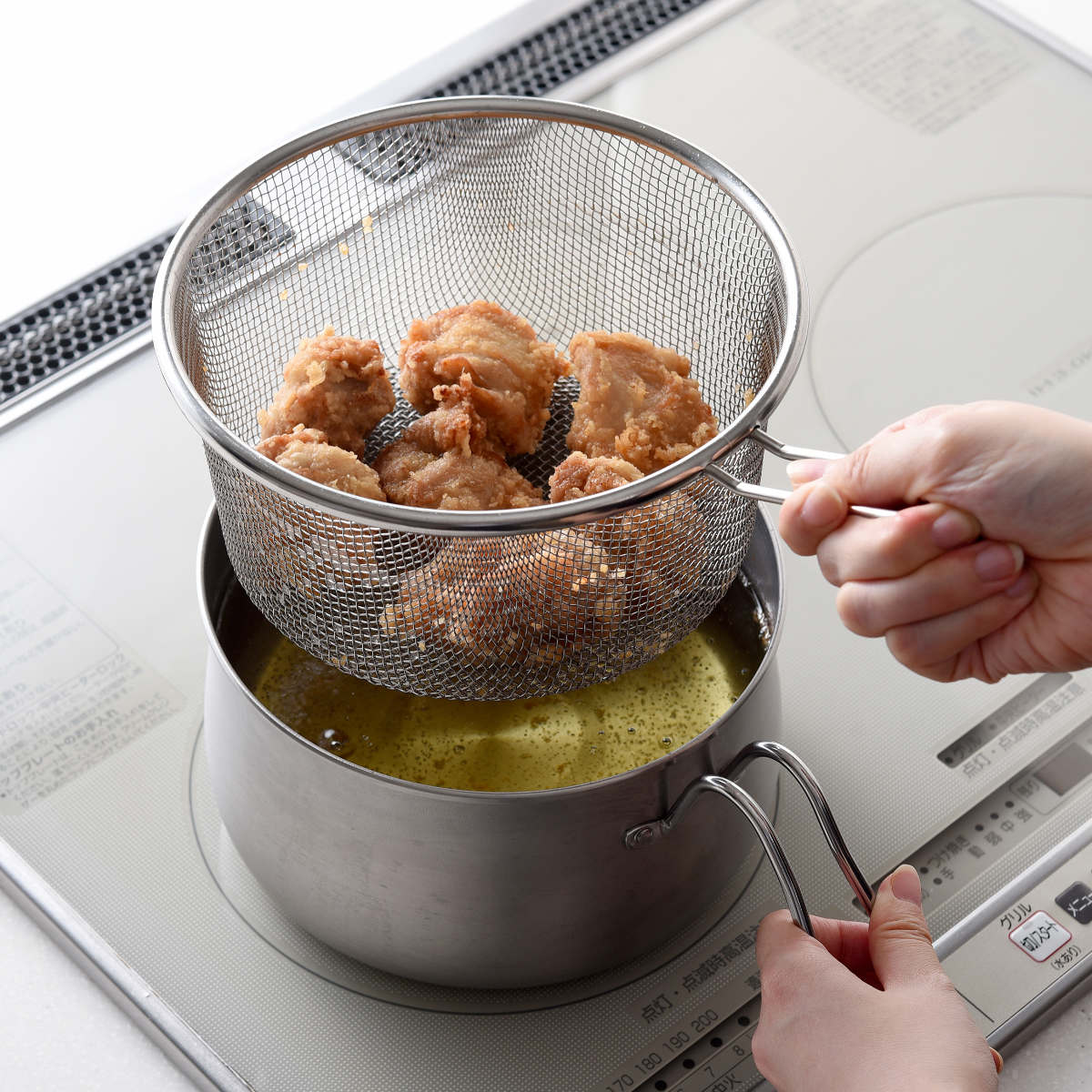 ストレーナーでから揚げやフライドポテトなどを一気に引き上げられ、時間差による揚げムラを防ぎます。野菜などを洗ったりザルとして使っても便利です。