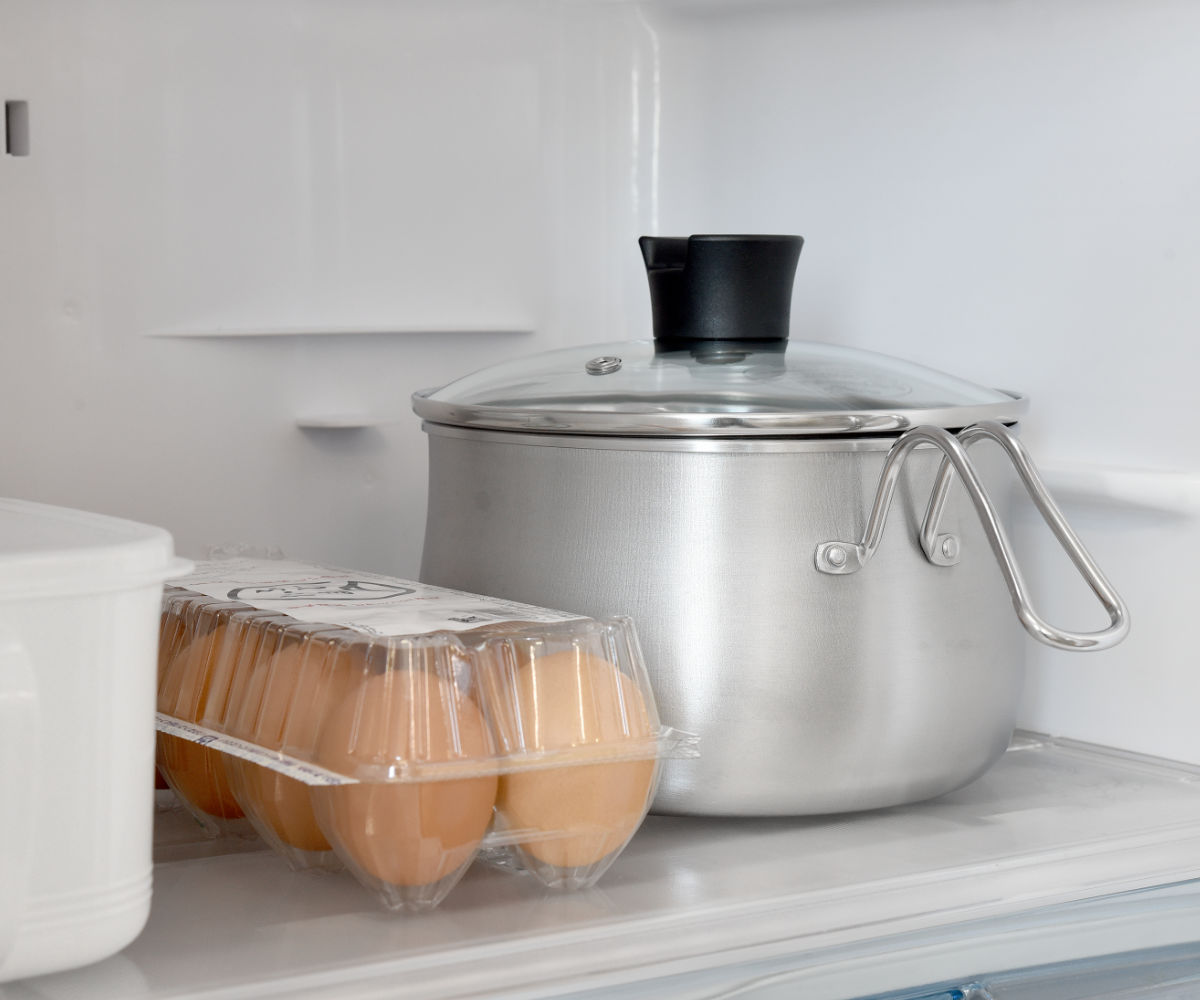 1~2日程度ならお鍋のまま保存ができます。ハンドルが下向きに設計されているので、冷蔵庫でも場所を取らずすっきり収まります。