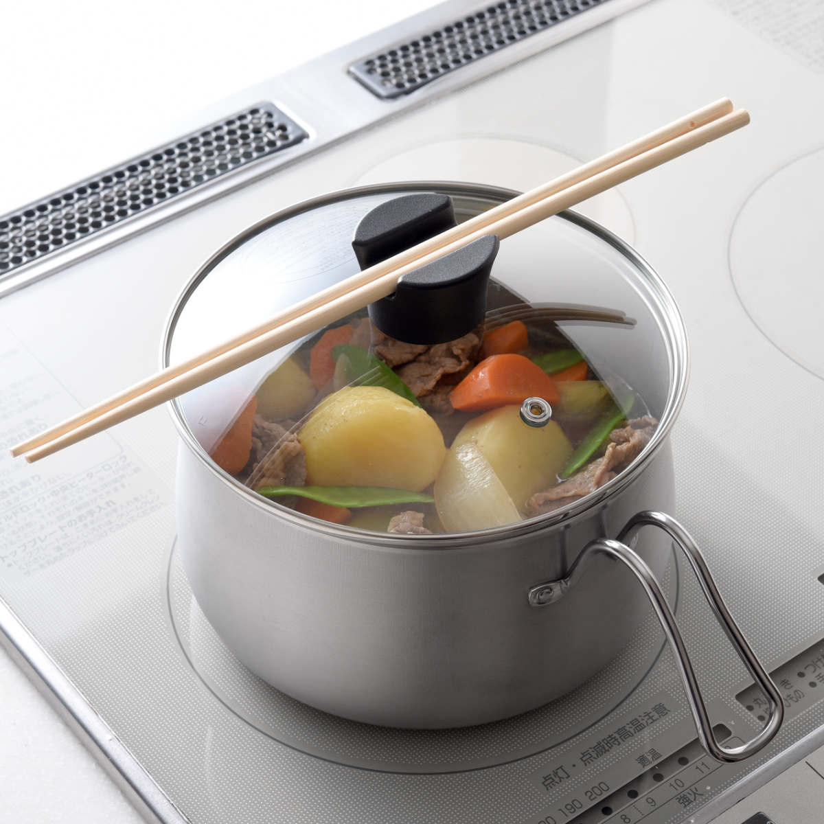 ガラス蓋付きなので、蓋を開けずに加熱具合や食材の状態を確認できます。火加減調整がしやすく、調理の失敗を防げます。持ち手にはくぼみがあり、お玉や菜ばしなどを一時置きできて便利です。