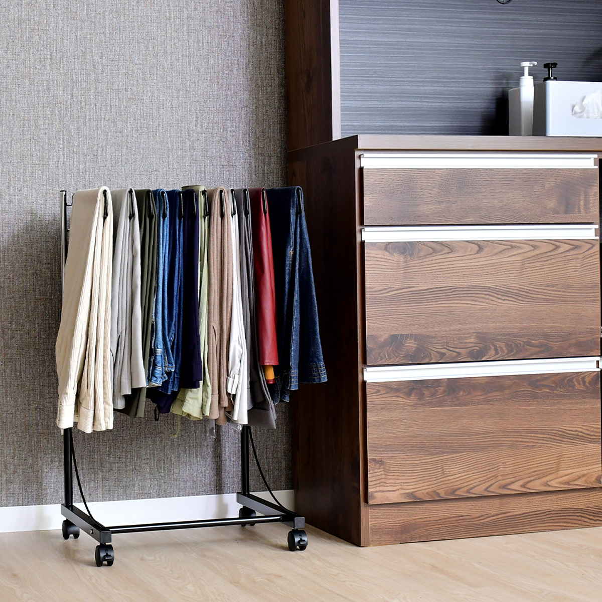 スラックスを1本ずつ掛けて収納できるため、畳む手間がなくなります。シワを防ぎながら、いつでもきれいな状態で履けるのが魅力です。また、スラックスだけでなく、スカートやネクタイ、ストールの収納にもお使いいただけます。衣類をまとめて管理でき、クローゼット周りがすっきり整います。毎日の身支度がスムーズになり、忙しい朝にも活躍します。