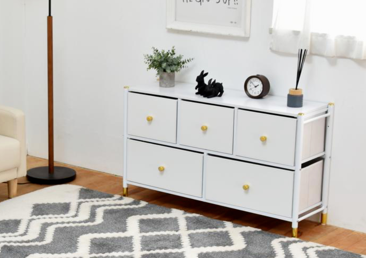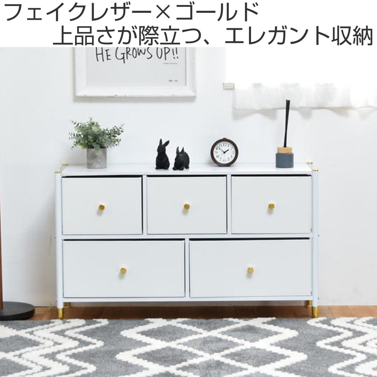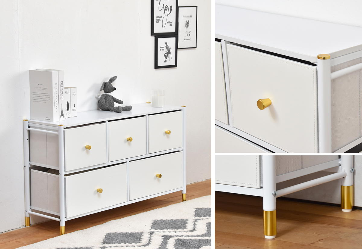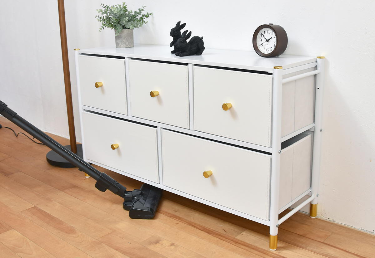 無駄のないすっきりとしたフォルムに、上品な色使いが魅力のチェストです。引出しは大小5杯あり、たっぷり収納できます。リビングにも寝室にも自然となじむエレガントなデザインで、置くだけで空間を明るく整えます。