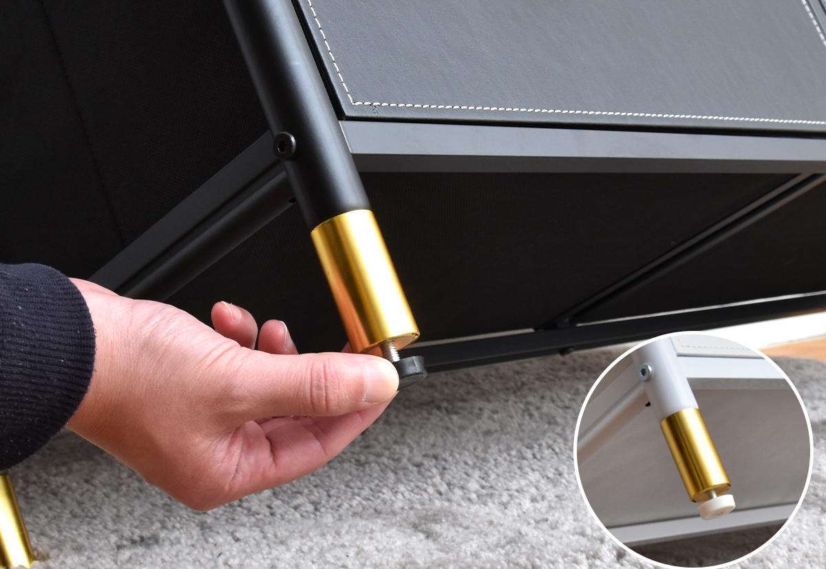 わずかな床の傾きにも対応できるアジャスター付きです。デザイン性だけでなく、使いやすさと安定感にもこだわりました。