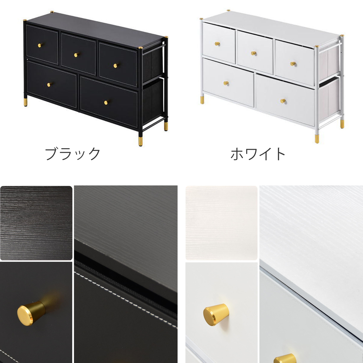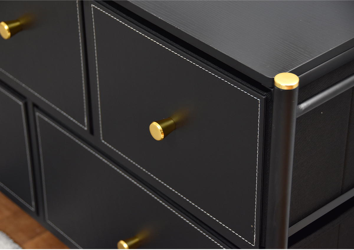 | 材質 | 天板、側板、底板:パーティクルボードにメラミン貼り 引き出し前板:合成皮革(ポリウレタン) フレーム:スチールパイプ(粉体塗装) 引出し:ポリエステル不織布(芯材)、MDF、紙 取っ手、アジャスター:ポリプロピレン |