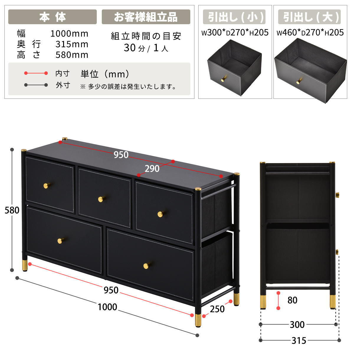 | 引き出し1段あたり耐荷重 | 引出し小:3kg(×3) 引き出し大:5kg(×2) |