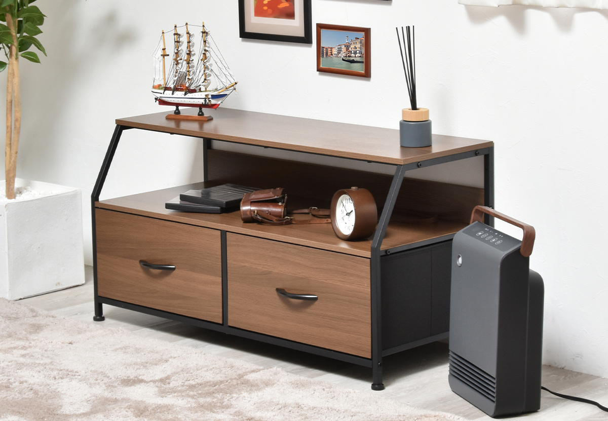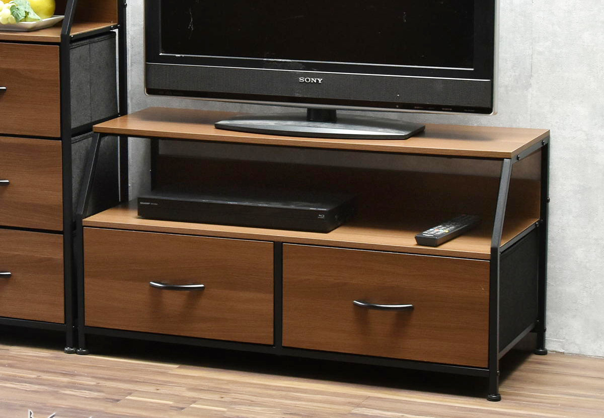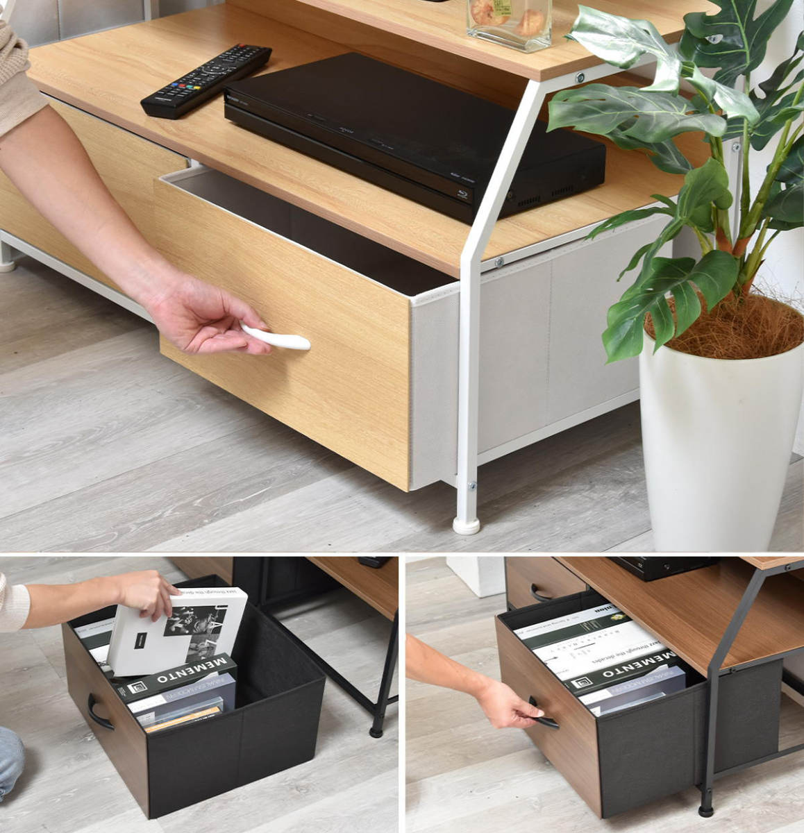 木目調の天板と引き出しに、スチールフレームを組み合わせたシンプルなデザインで、ナチュラルからインダストリアルまで幅広いインテリアに馴染みます。オープンスペースと引き出し収納を備えており、AV機器や小物をすっきりまとめて収納できます。