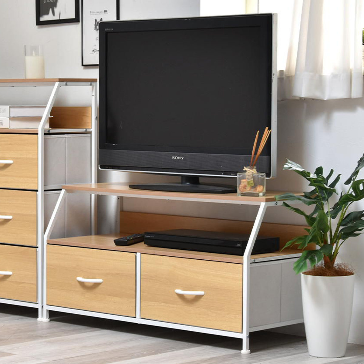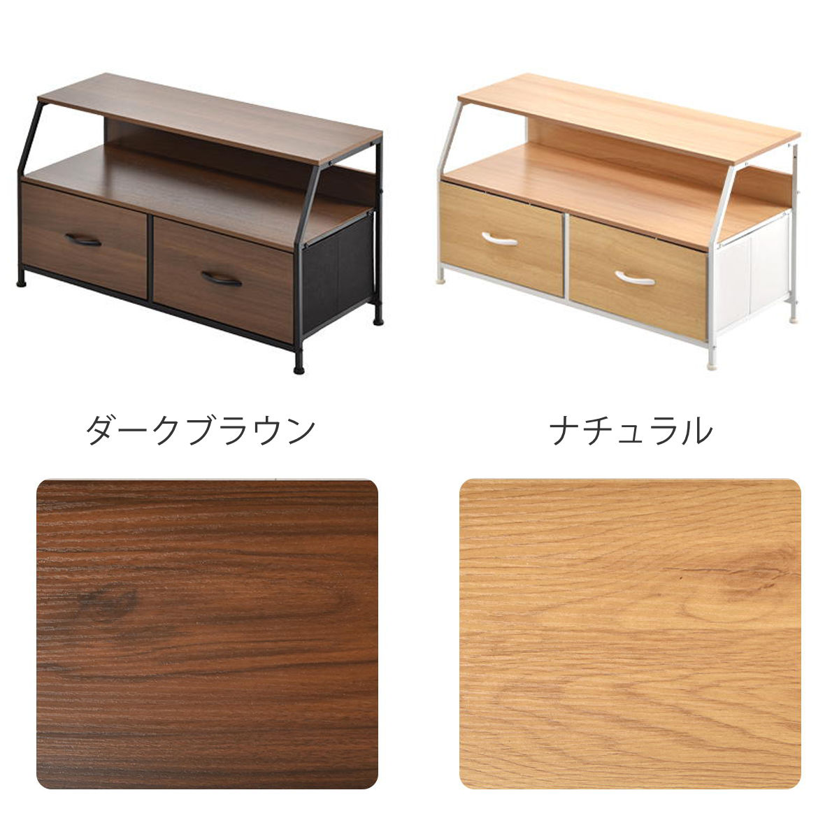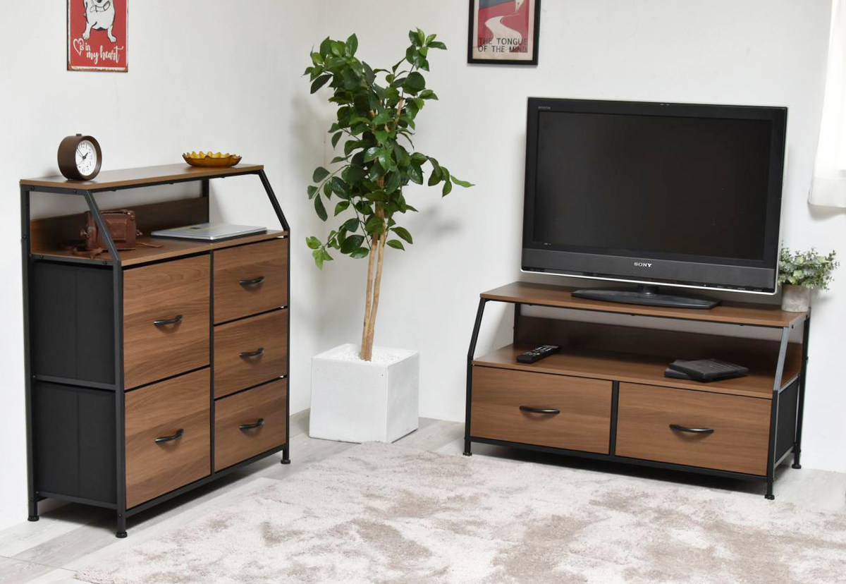 木目調の天板と引き出しに、スチールフレームを組み合わせたシンプルなデザインで、ナチュラルからインダストリアルまで幅広いインテリアに馴染みます。オープンスペースと引き出し収納を備えており、AV機器や小物をすっきりまとめて収納できます。