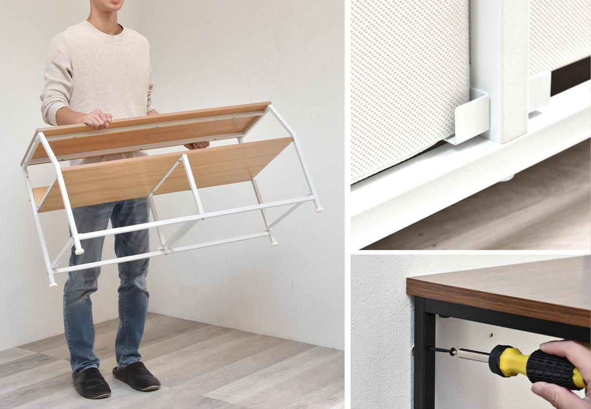 付属の工具のみで簡単に組み立てが可能です。引き出しが後ろに落ちるのを防ぐ落下防止パーツや、ローボードと壁を固定できる転倒防止用のネジも付属しており、安心してお使いいただけます。