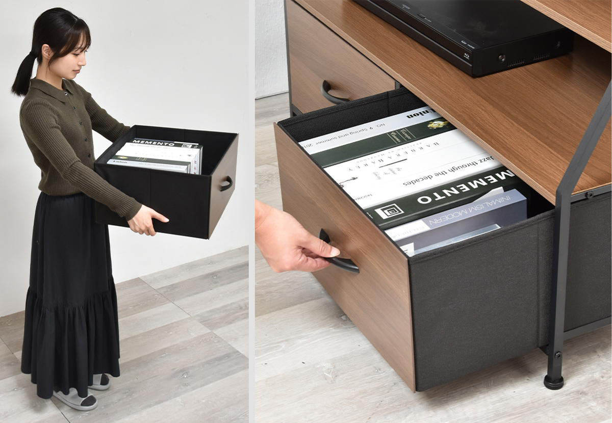 雑誌や日用品、AV機器まわりのアイテムをすっきり収納できます。生活感の出やすい小物を隠して収納でき、見た目も整います。