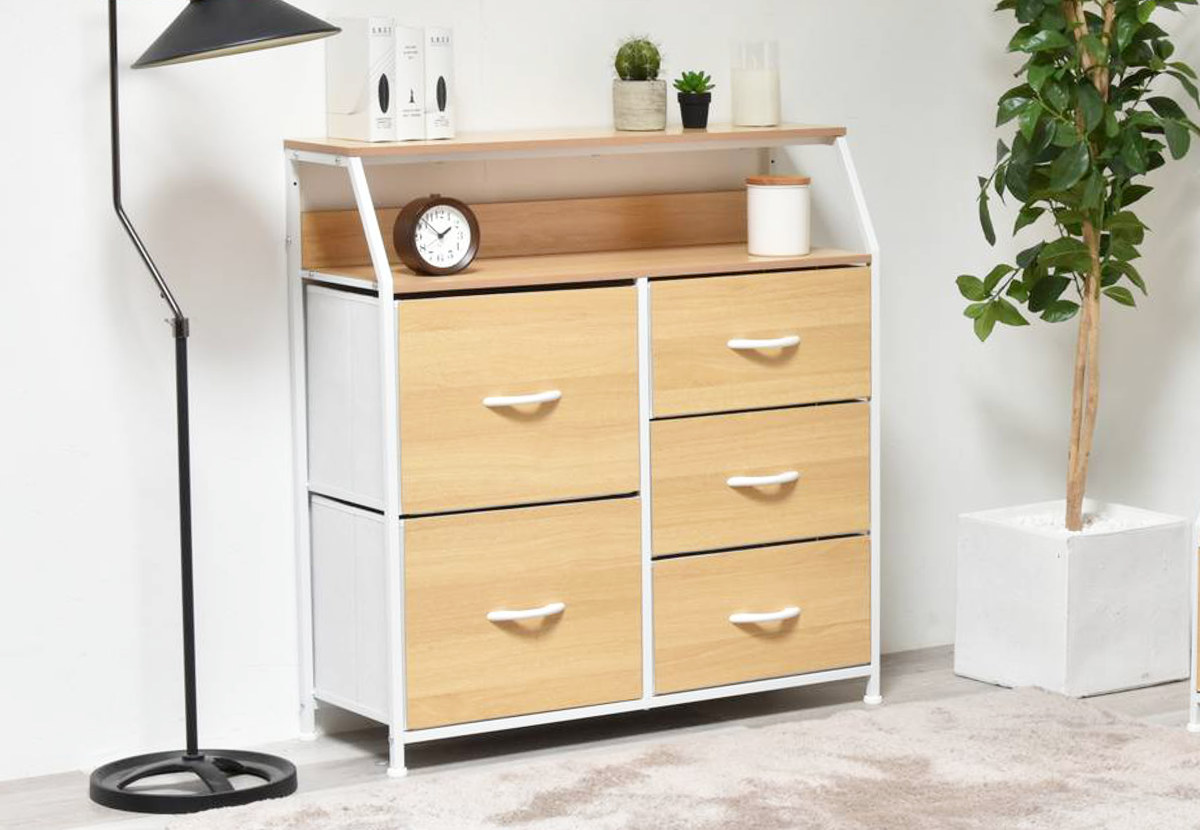 リビングチェスト 幅84.5cm 3段 引き出し5杯 収納 木目調 脚付き