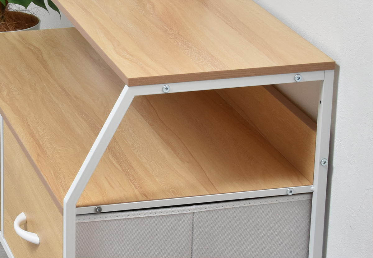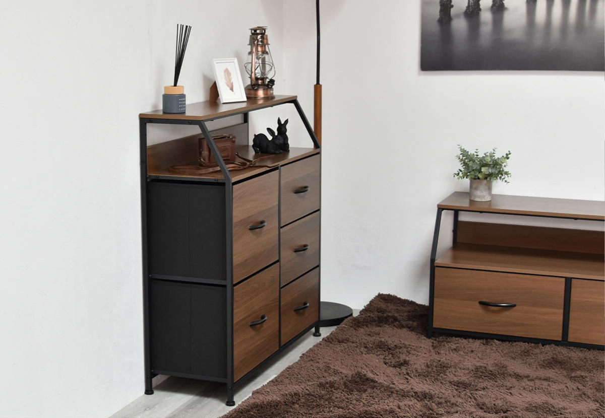 同シリーズのチェストやテレビボードと組み合わせることで、木目とスチールが調和した統一感のあるインテリアを演出できます。リビングや寝室など、空間全体をすっきりとまとめたい方におすすめです。