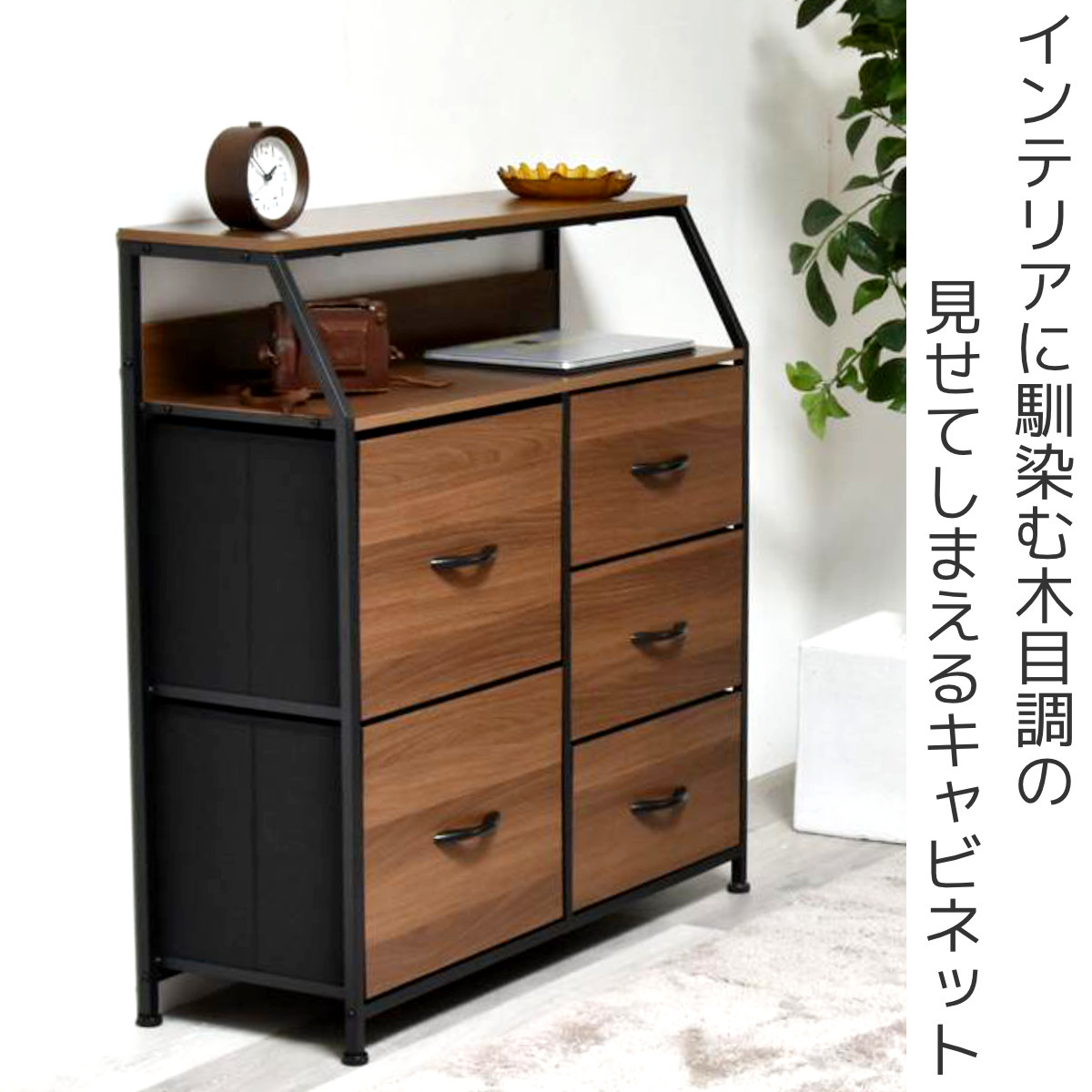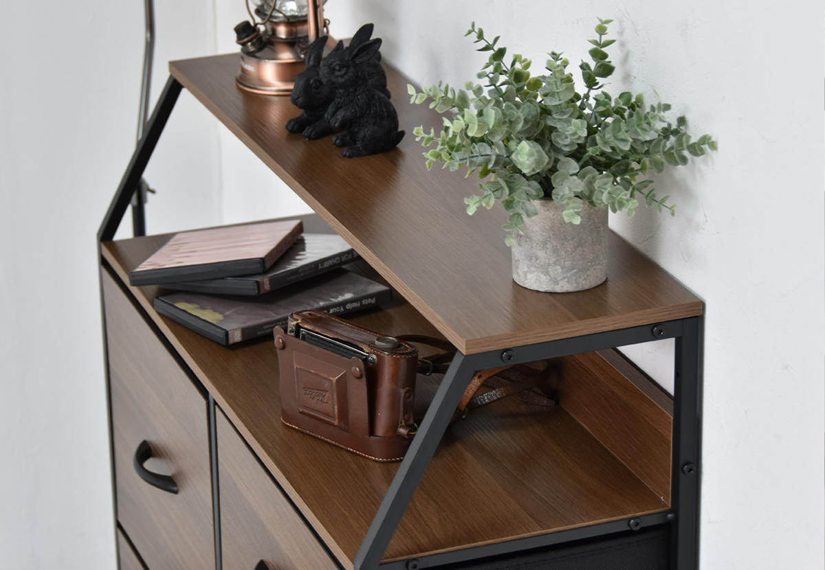 木目調の温かみとスチールの組み合わせが、空間を引き締めるキャビネットです。ナチュラルからインダストリアルまでさまざまなインテリアに馴染み、リビングや玄関、書斎など幅広いシーンで活躍します。