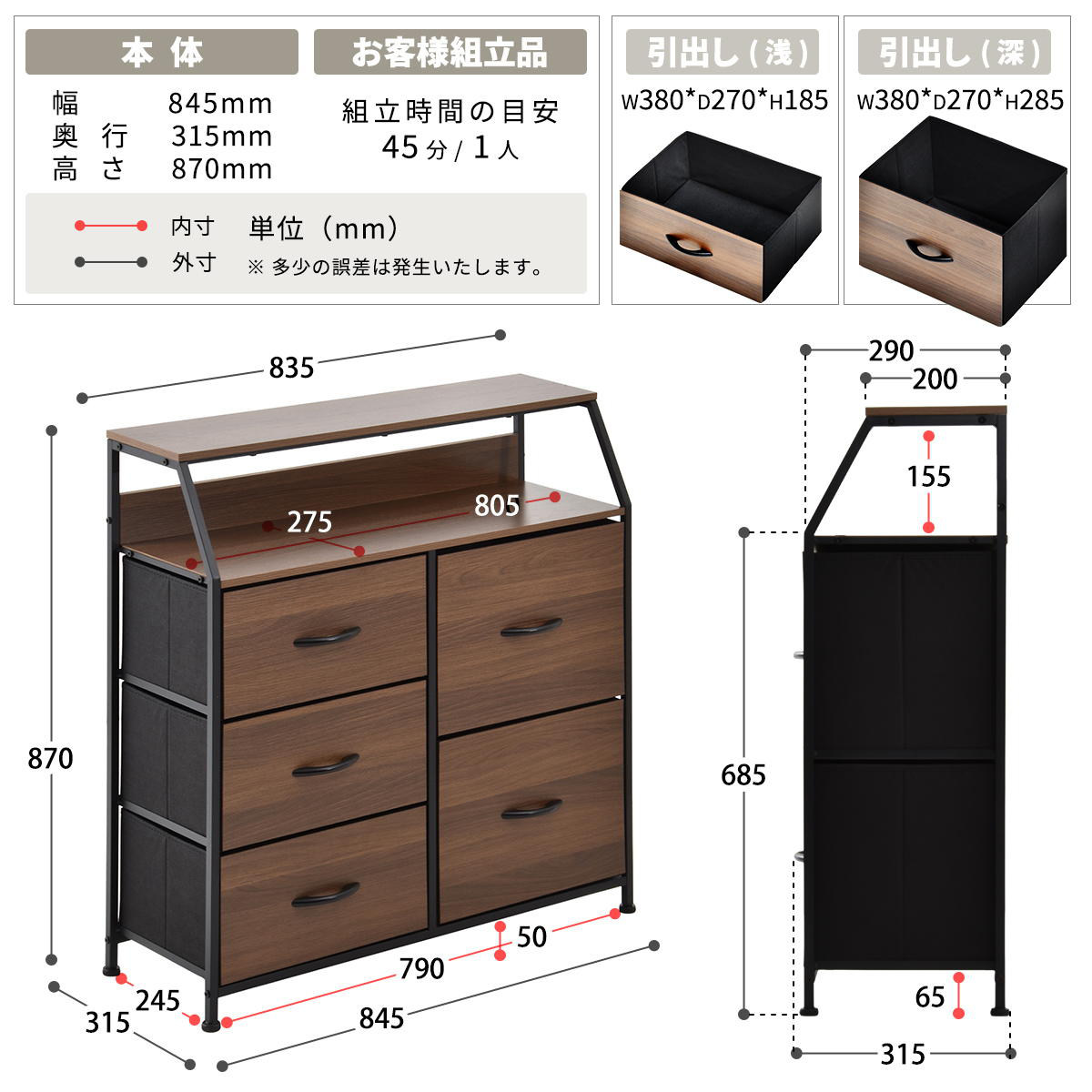 | 引き出し1段あたり耐荷重 | 5kg |