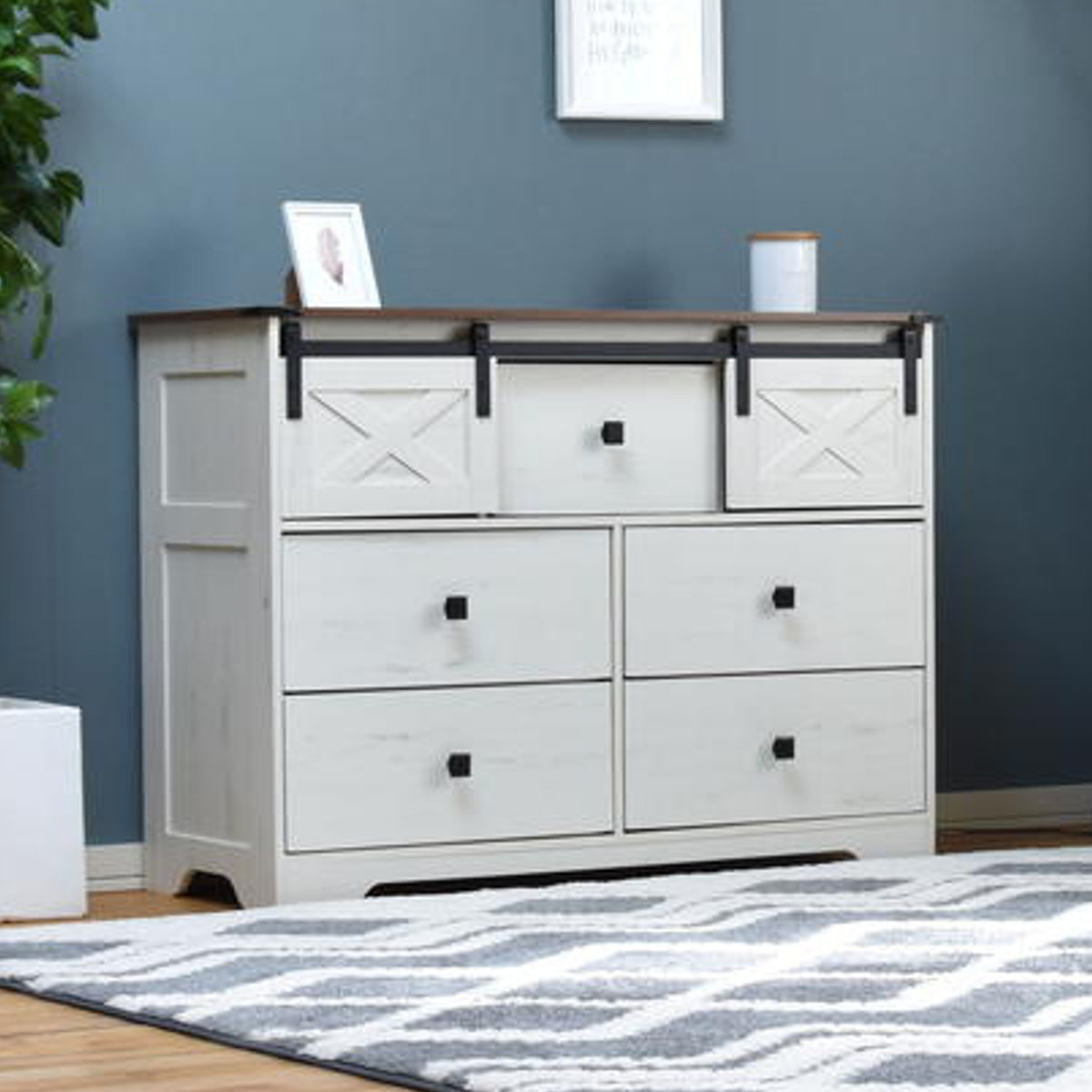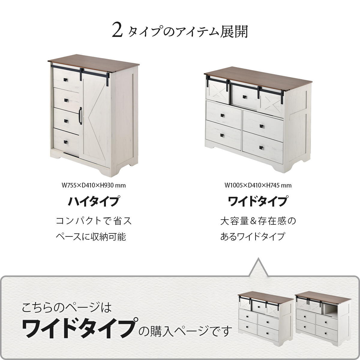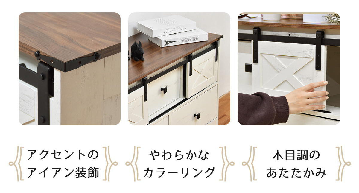 ナチュラルで落ち着いた雰囲気の中に、どこか懐かしさや安心感を感じられるファームハウススタイルのチェストです。扉で隠す収納棚と引き出し収納を備え、生活感を抑えた美しい空間を演出します。