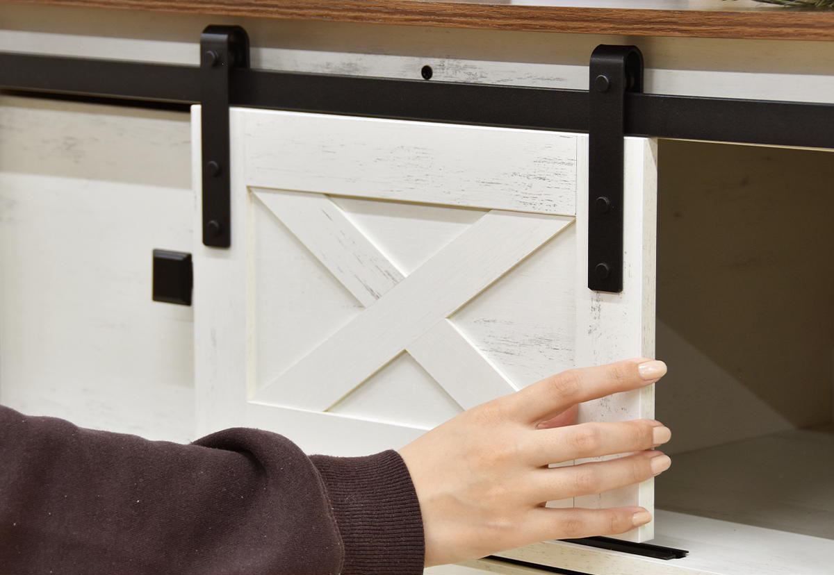 軽い力でスムーズに開閉ができるスライド扉は、ブラックスチールとホワイト木目のコントラストがアクセントになっています。