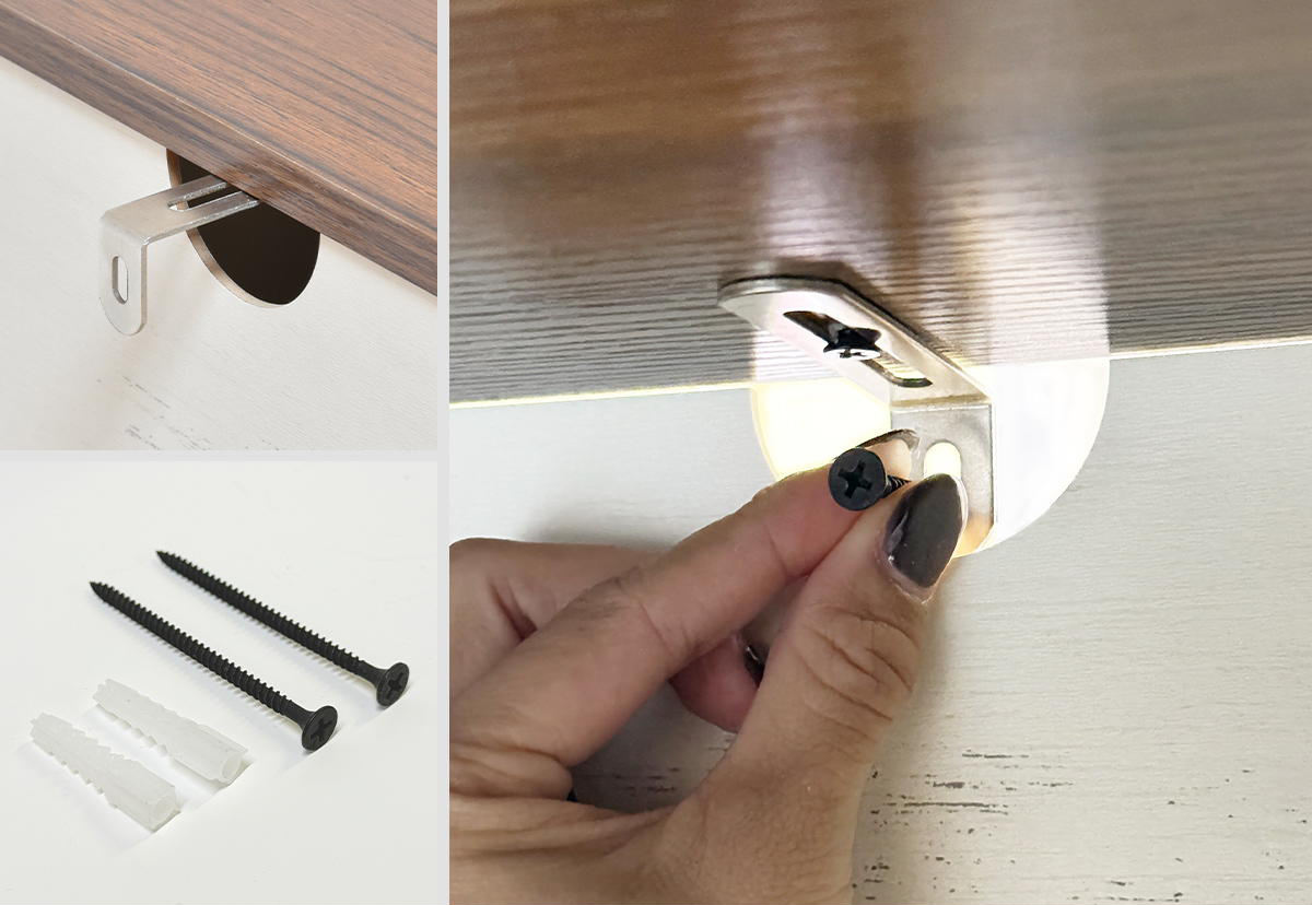 専用の金属パーツと固定用ネジセットが付属しています。バンドで固定するタイプが多い中、丈夫な金属パーツで天板と壁をしっかり固定でき、見た目もスマートに取り付けられます。