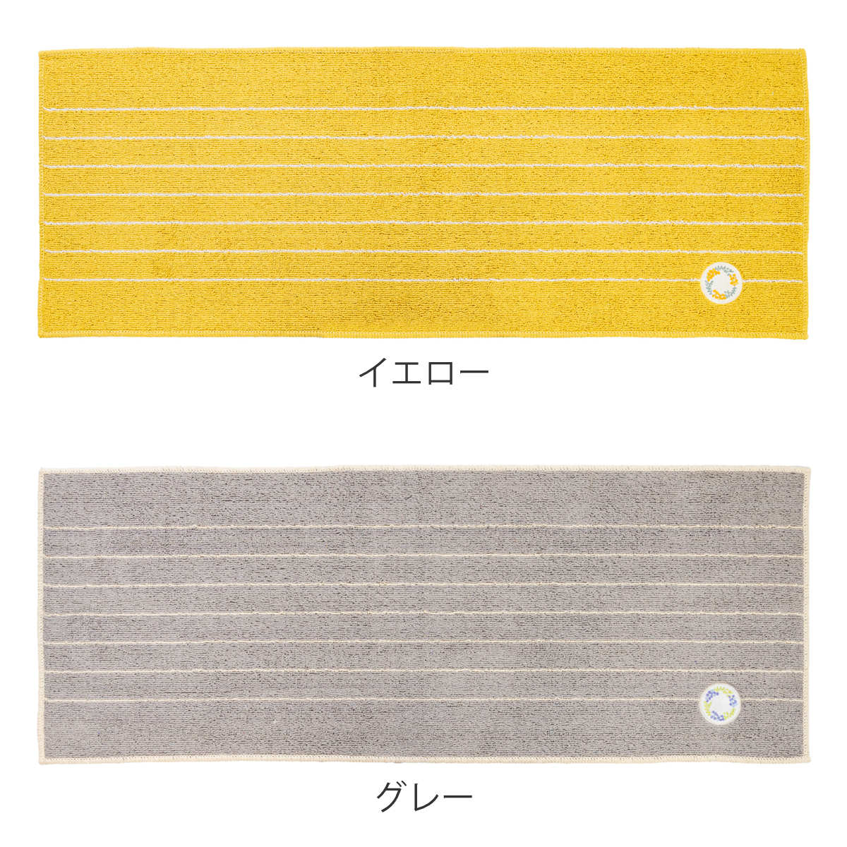 ミモザとベリー系の果物がモチーフの、可愛らしいリースのワッペンをあしらったキッチンマットです。キッチンを明るい印象にしてくれるイエローとインテリアに馴染みやすいグレーの2色からお選びいただけます。しっかりとした色味で汚れやすいキッチンでも気軽にお使いいただけます。