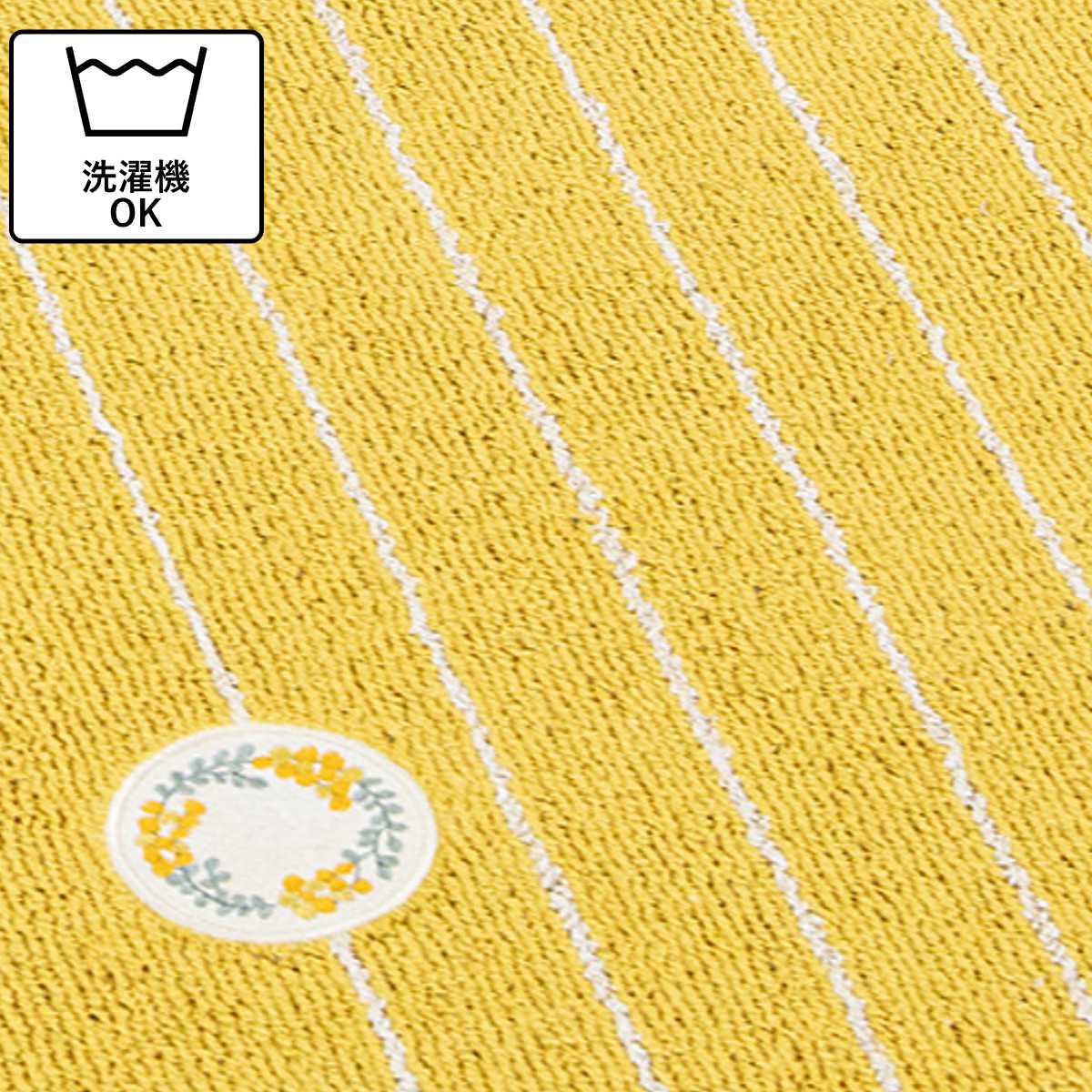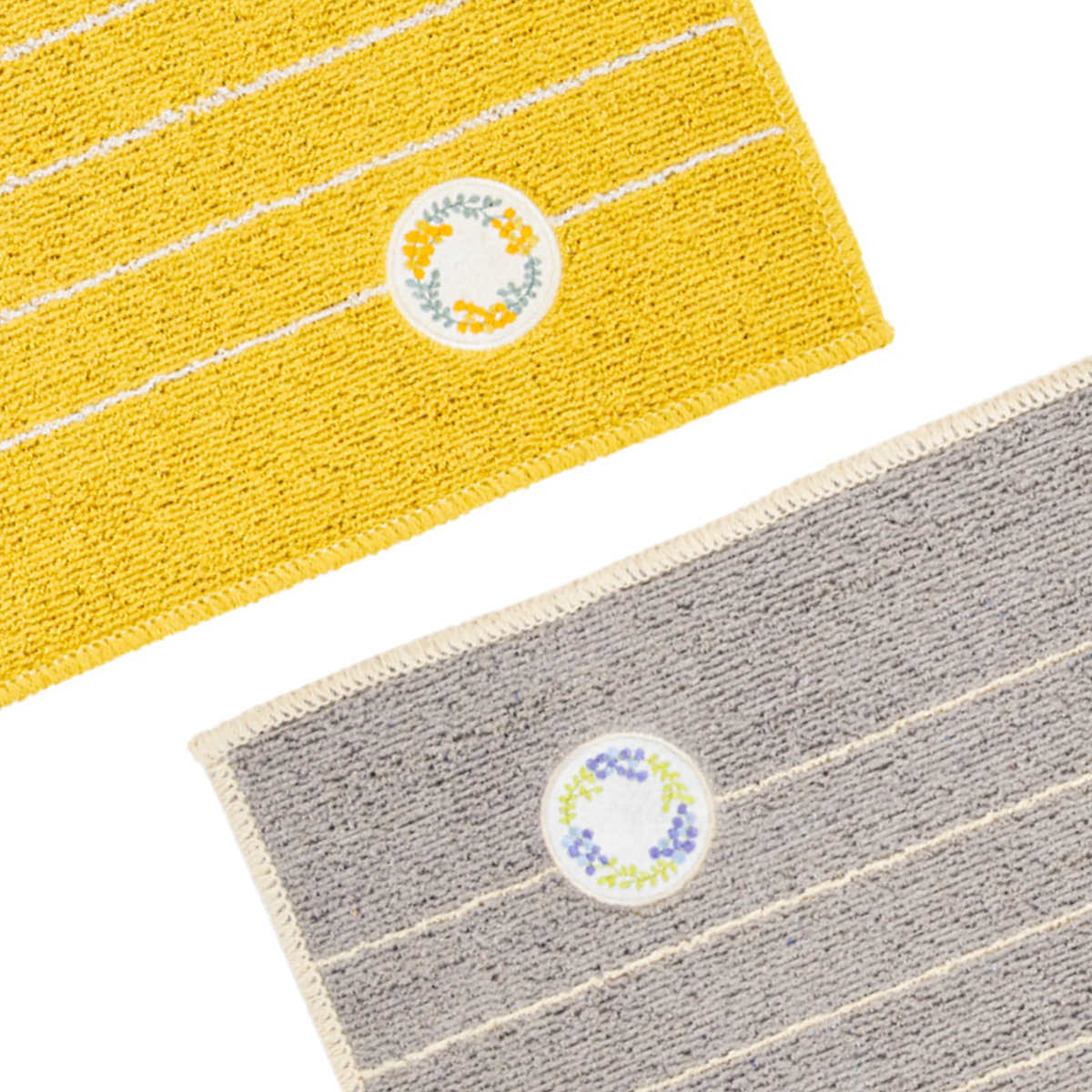 ミモザとベリー系の果物がモチーフの、可愛らしいリースのワッペンをあしらったキッチンマットです。キッチンを明るい印象にしてくれるイエローとインテリアに馴染みやすいグレーの2色からお選びいただけます。しっかりとした色味で汚れやすいキッチンでも気軽にお使いいただけます。