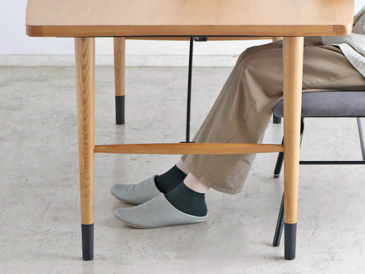 脚部は直線的ですっきりとしたH字型デザイン。テーブル全体をしっかり支えます。シンプルで主張しすぎず、ナチュラルからモダンまで幅広いインテリアに合わせやすいのも魅力。
