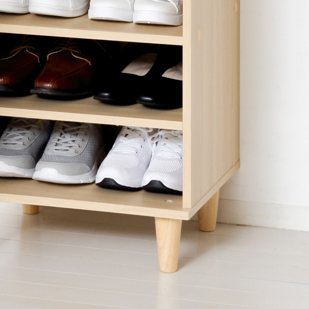 棚板は可動式のため、靴の高さに合わせて位置を調整できます。スニーカーやパンプスなど、さまざまな靴を効率よく収納できます。