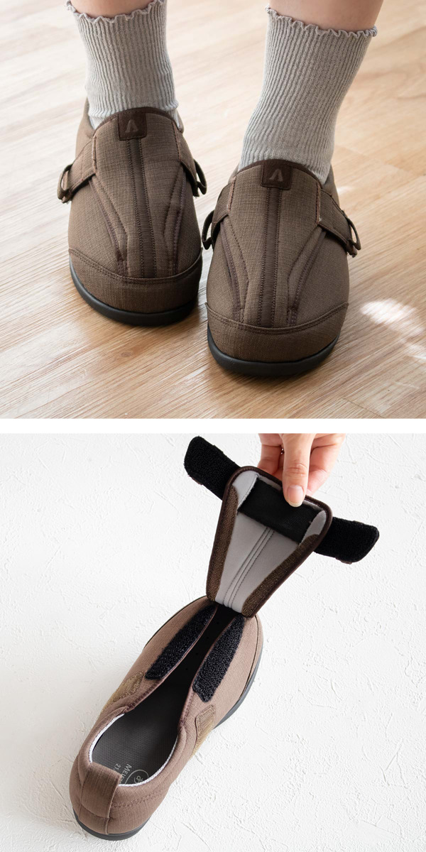 むくみや腫れがあるときも、足の状態に合わせてベルトで調整できます。外反母趾や甲高の方にもおすすめです。
