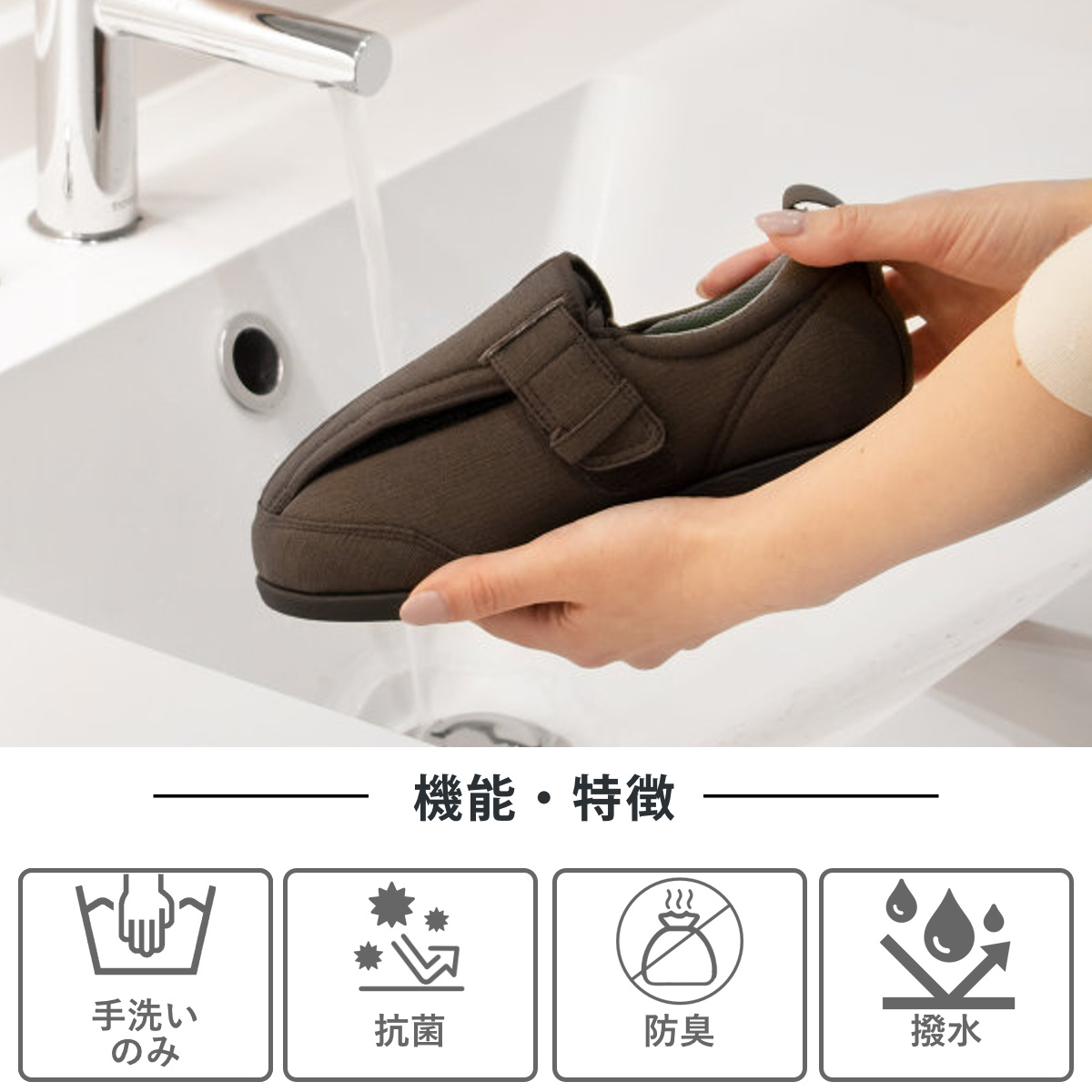 抗菌・防臭加工(インソール・中底のみ)で、撥水加工がされており、いつでも快適にお履きいただけます。汚れてしまった場合も、手洗いが可能なので清潔に保てます。