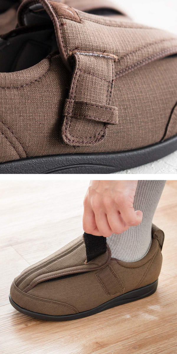 トゥボックスが高く、つま先にゆとりを持たせた構造のシューズです。履き口が大きく開くため、介助者にとっても履かせやすいです。足指が折れ曲がっていないか等、つま先の状態を確認しながら足入れできます。
