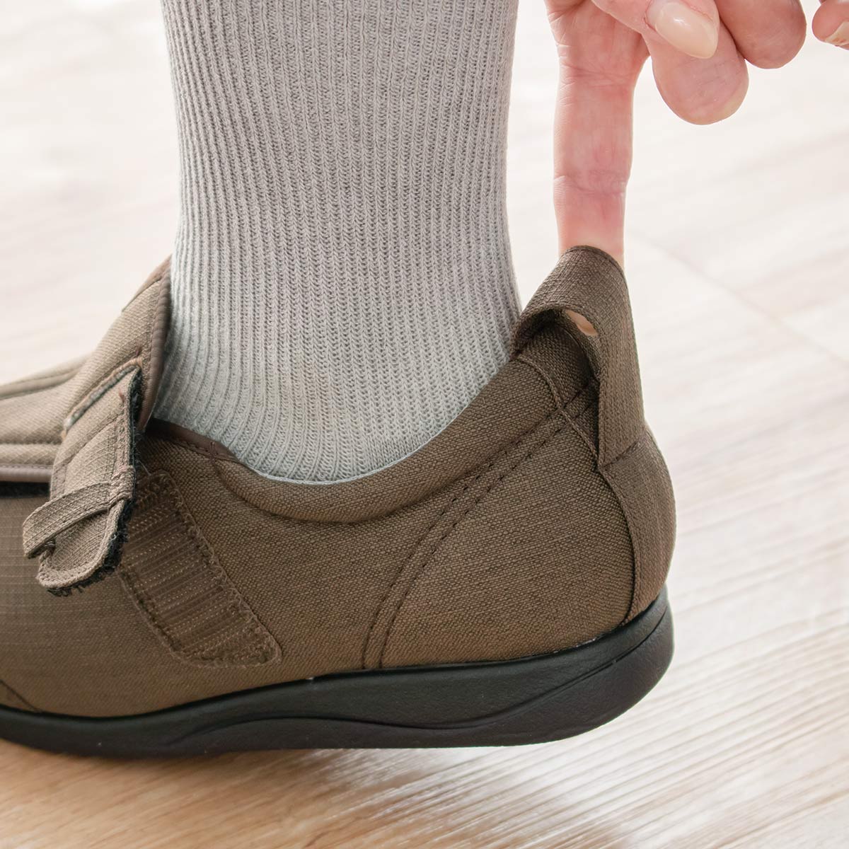 かかとの上部にループが付いているので、指に力が入りにくい人やシューズのかかとに指を入れて履くという細かい動作がしにくい人でも楽に履いていただけます。