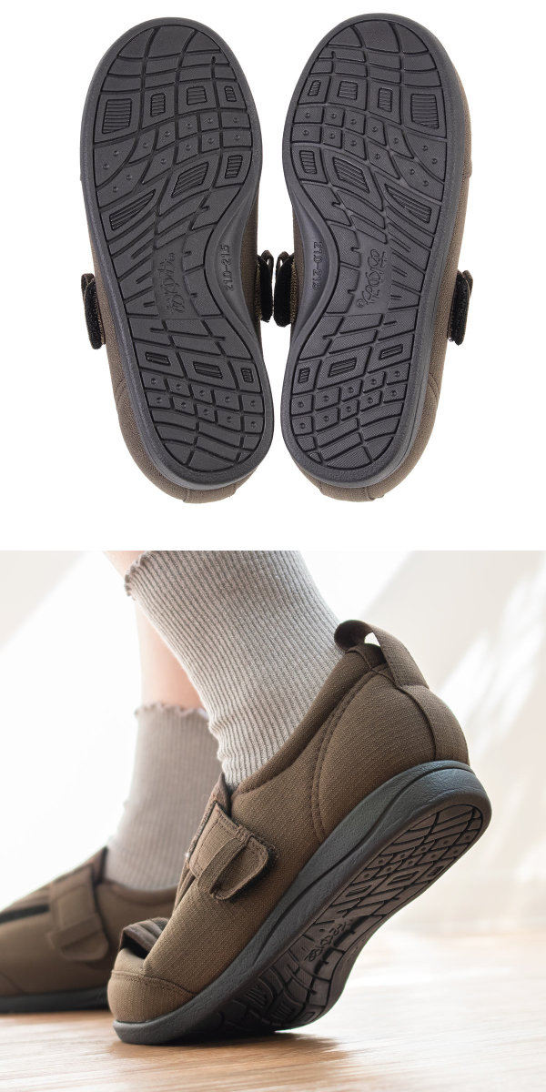足囲・足幅がゆったりした5Eサイズなので、履いていて楽です。かかとがあるのでデイサービスでのご利用や入院時の上履きにも可能です。