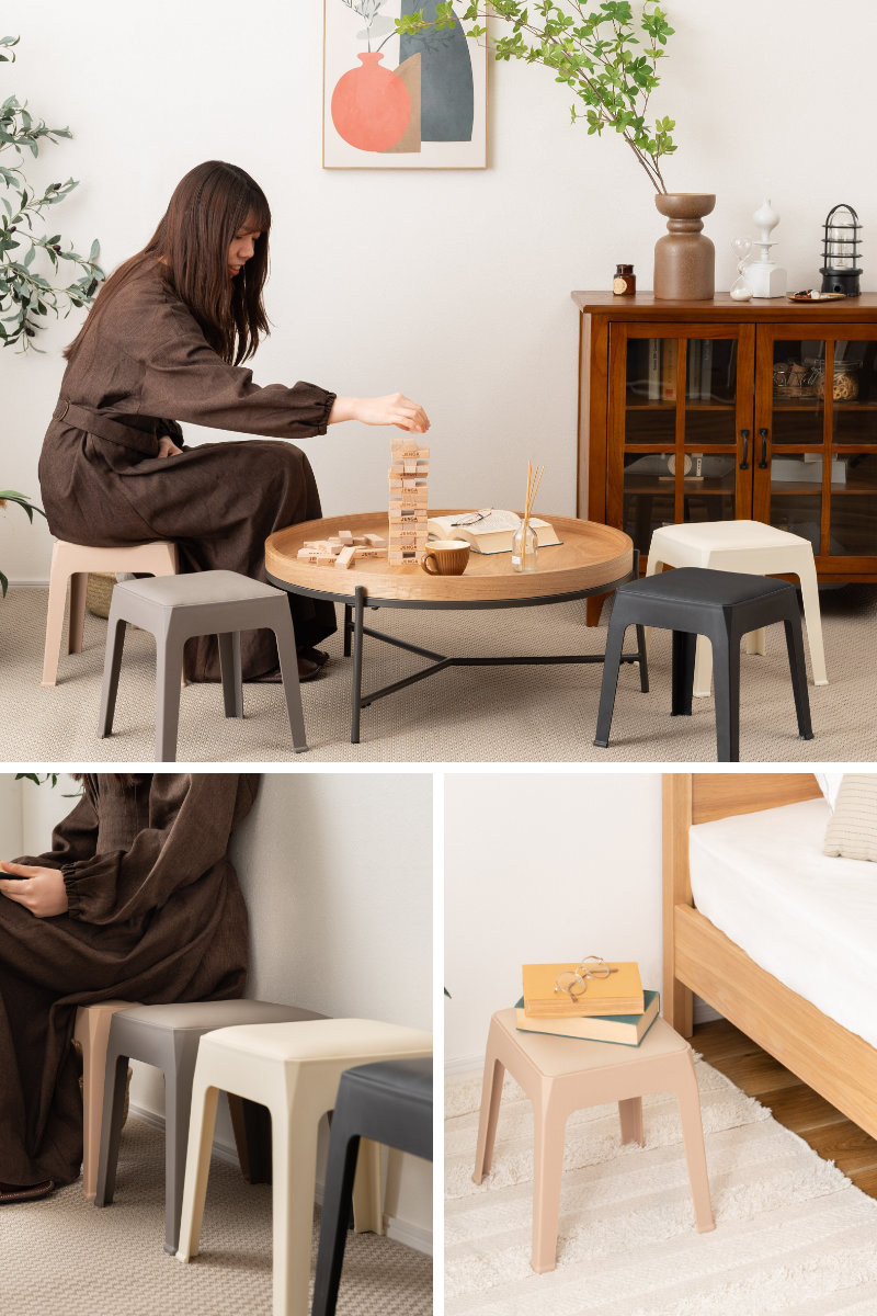 高さ31cmのロースタイルのスツールなので、ローテーブル用チェアや、玄関でのちょい掛け、ベッドサイドなど多用途にご使用いただけます。圧迫感がなく、お部屋に置きやすいサイズ感です。