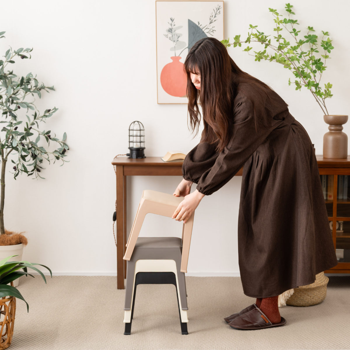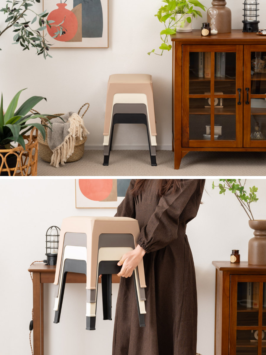 使わないときは重ねてすっきり収納できます。重ねた姿も美しく、生活感を抑えながらインテリアの一部として空間に溶け込みます。複数脚揃えても場所を取りにくいので、来客用としてもお使いいただけます。