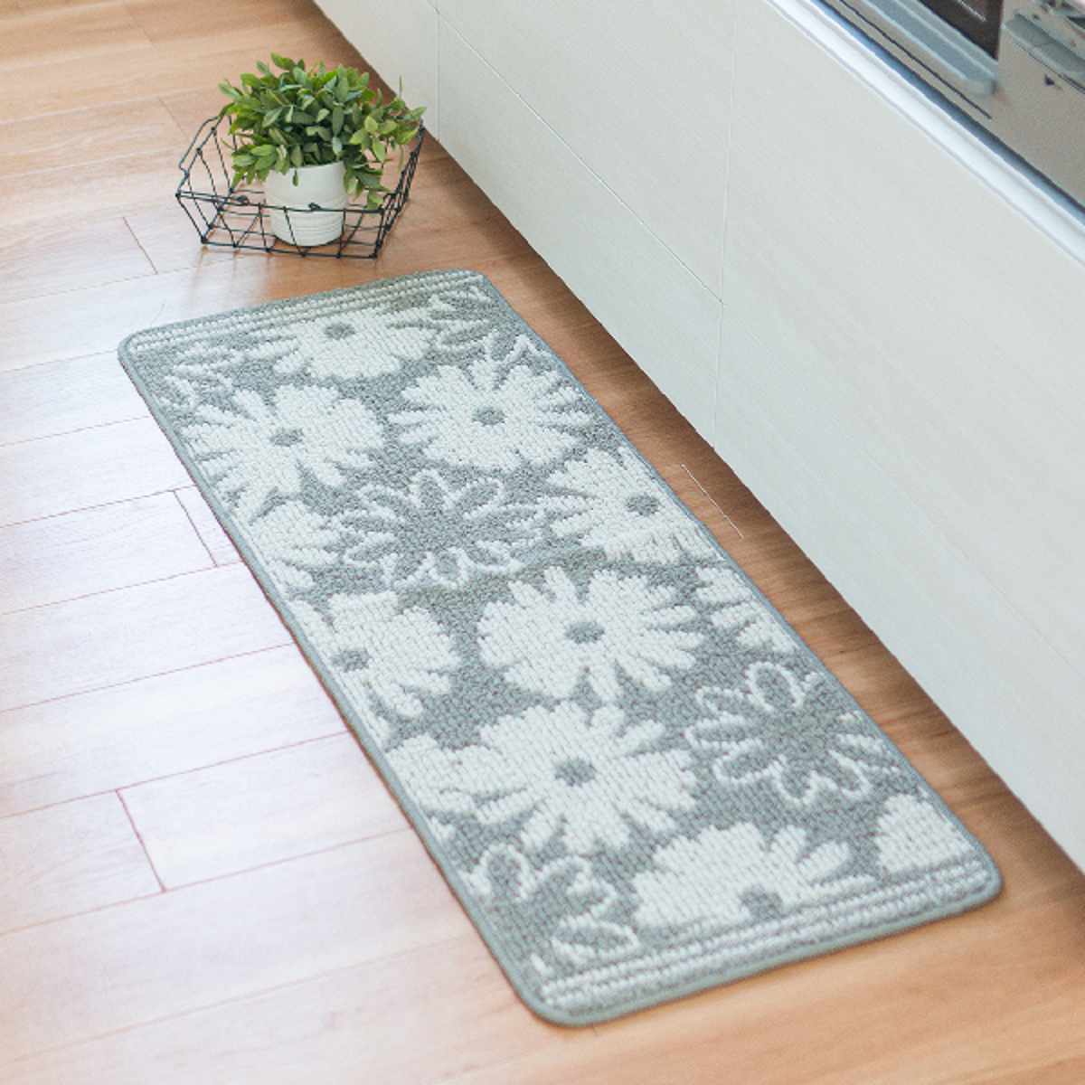 裏面にはすべり止め加工が施されており、キッチンでの急な動きでもズレにくく安心してお使いいただけます。薄すぎず厚すぎない絶妙な厚みで、つまずきにくく、掃除機もかけやすい扱いやすい仕様です。
