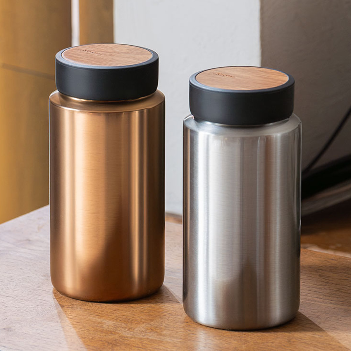 フタの天面には、世界有数のコーヒー産地であるアフリカで育った天然木「オクメ」を使用。赤褐色の木肌はマホガニーのように艶やかで、淹れたてのコーヒーや焙煎豆の深い色合いとも自然に調和します。使うほどに風合いが増し、やがて“自分だけの一本”へと育っていくのも魅力です。