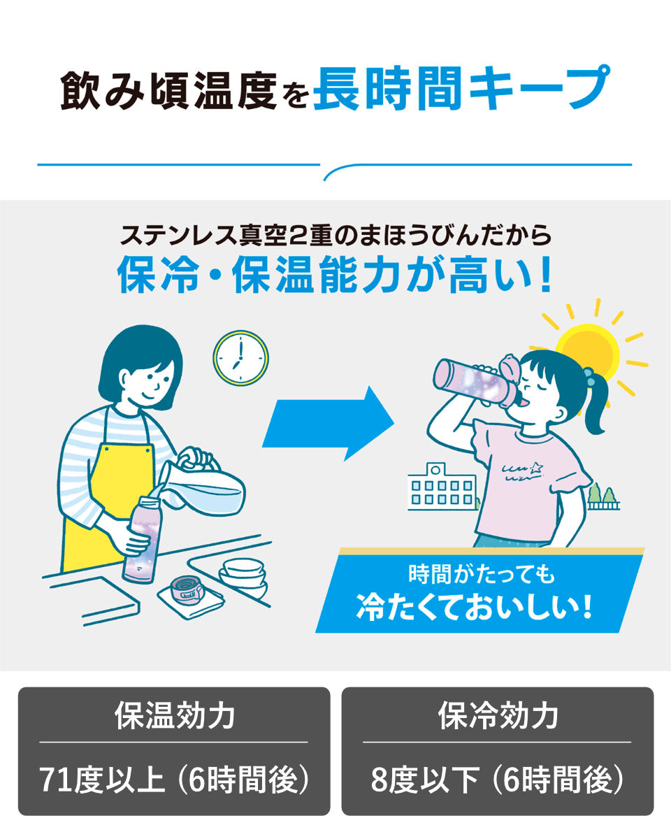 キンキンに冷えた飲みものも、熱々のドリンクも、ステンレス真空2重のまほうびんだから、長時間しっかりと飲みごろ温度をキープします。さらに、内面フッ素コートで汚れやニオイが残りにくく、本体丸洗いOKも嬉しいポイントです。