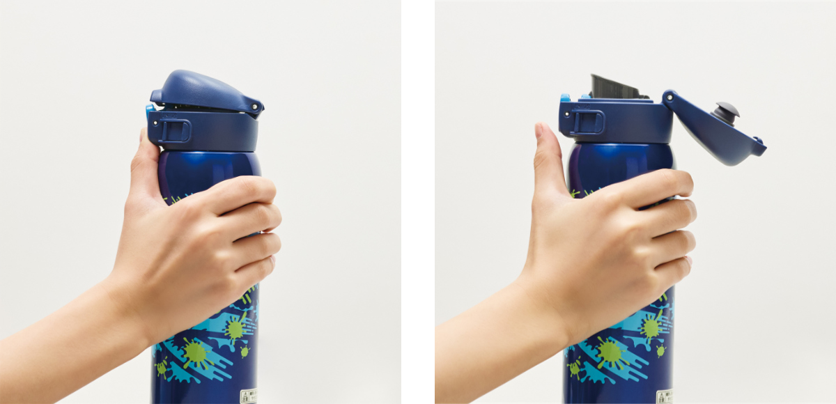勢いよく開いて水滴が飛び散らないように、少し開いた時に押したまま止めて、内側の水滴を落とすので、デスク周りの書類も濡れにくく安心です。