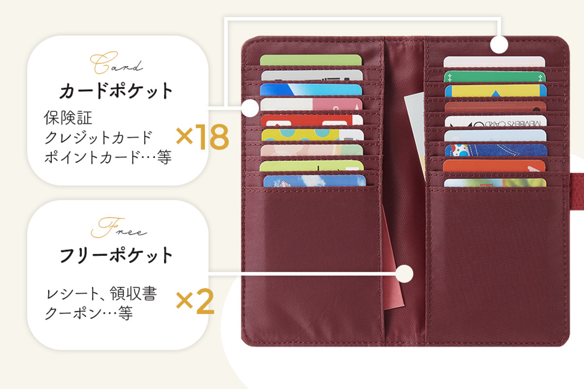 カードが18枚入るポケットに、レシートやクーポンなどを入れておけるフリーポケット2か所あります。カードが見つけやすい見開きタイプで使い勝手抜群です。