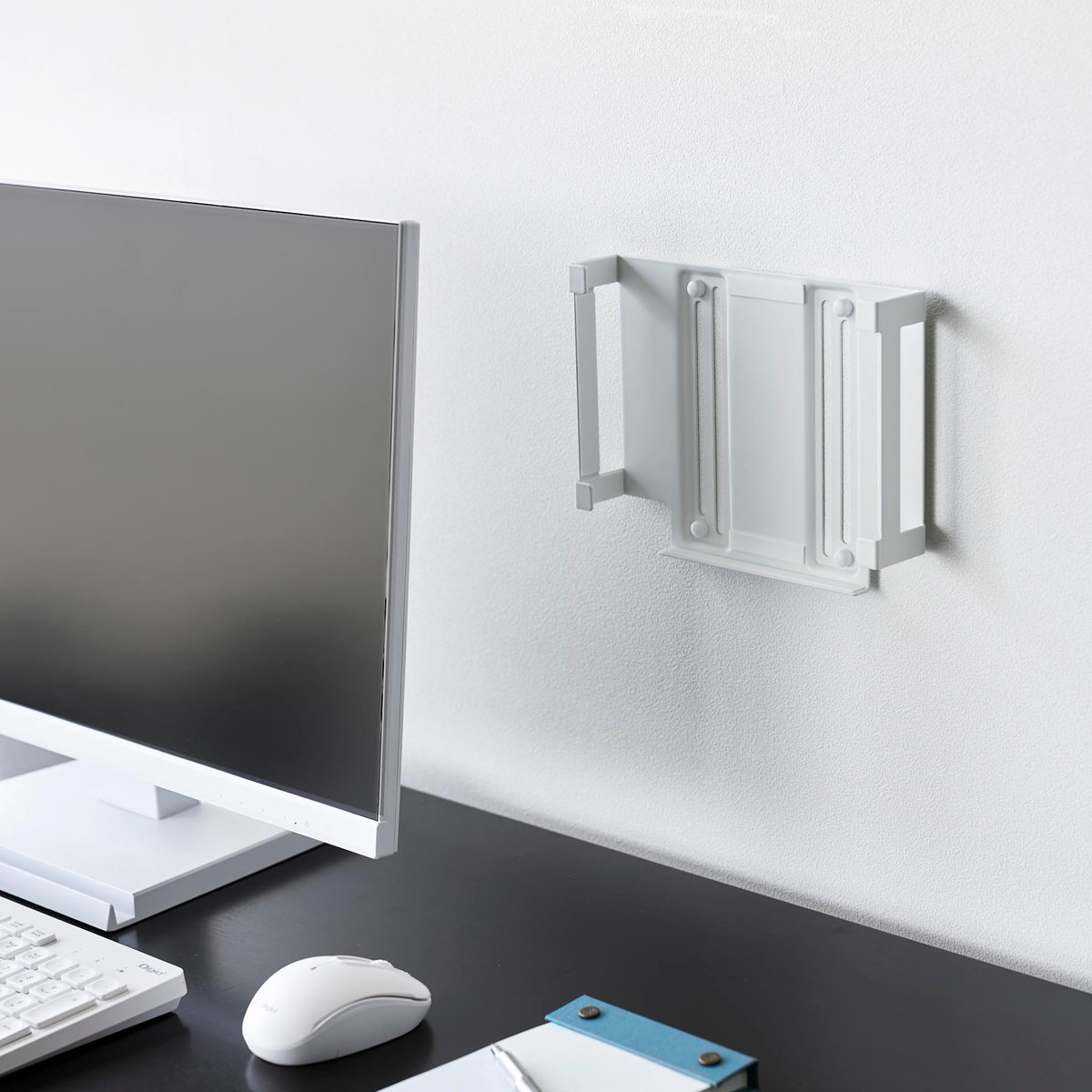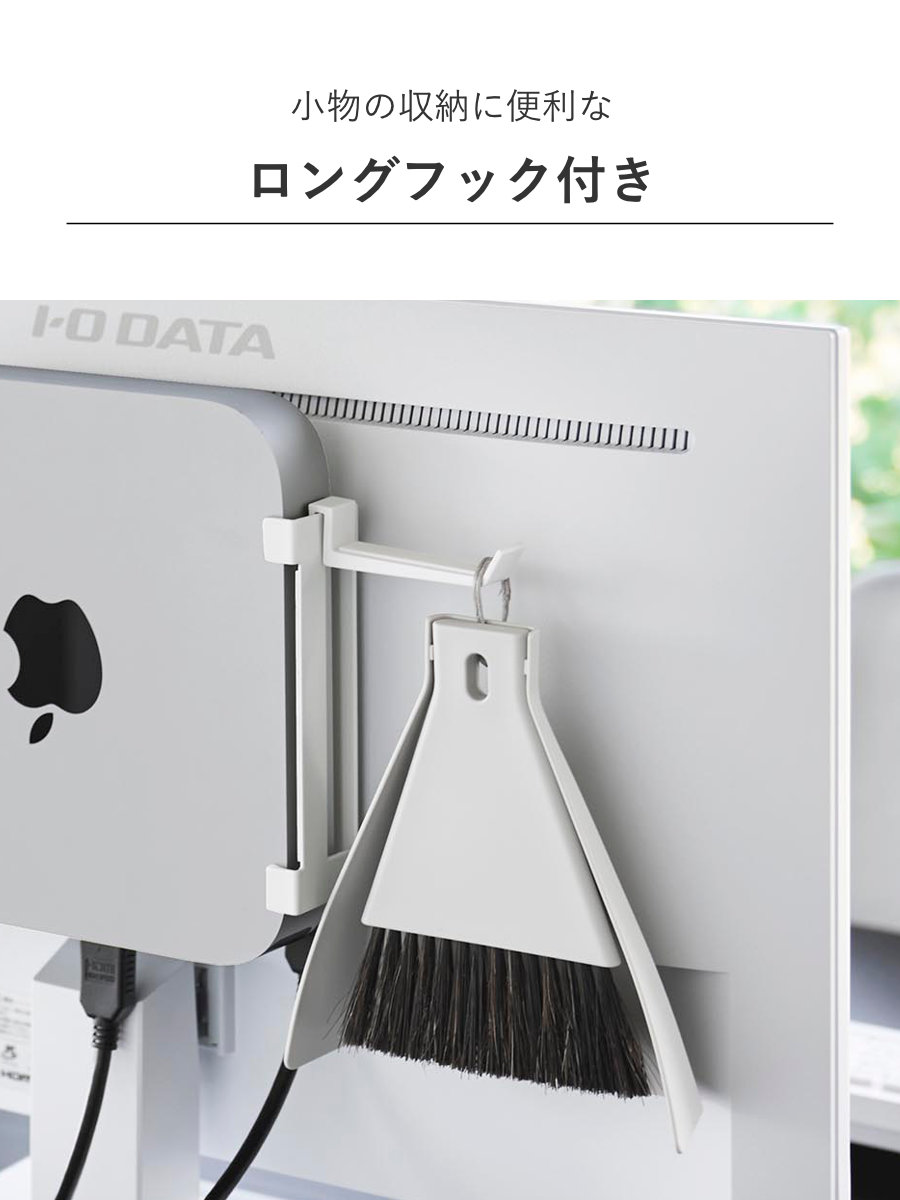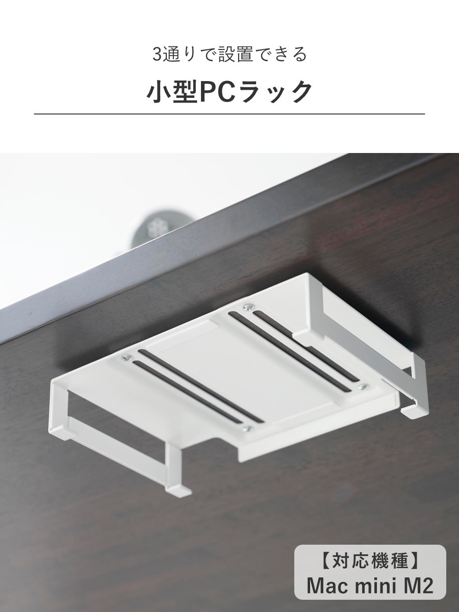 対応する小型PCを、モニター背面・デスク下・壁面の3通りで収納できるラックです。モニター背面やデスク下に設置して、デスク上を広く使うことができます。