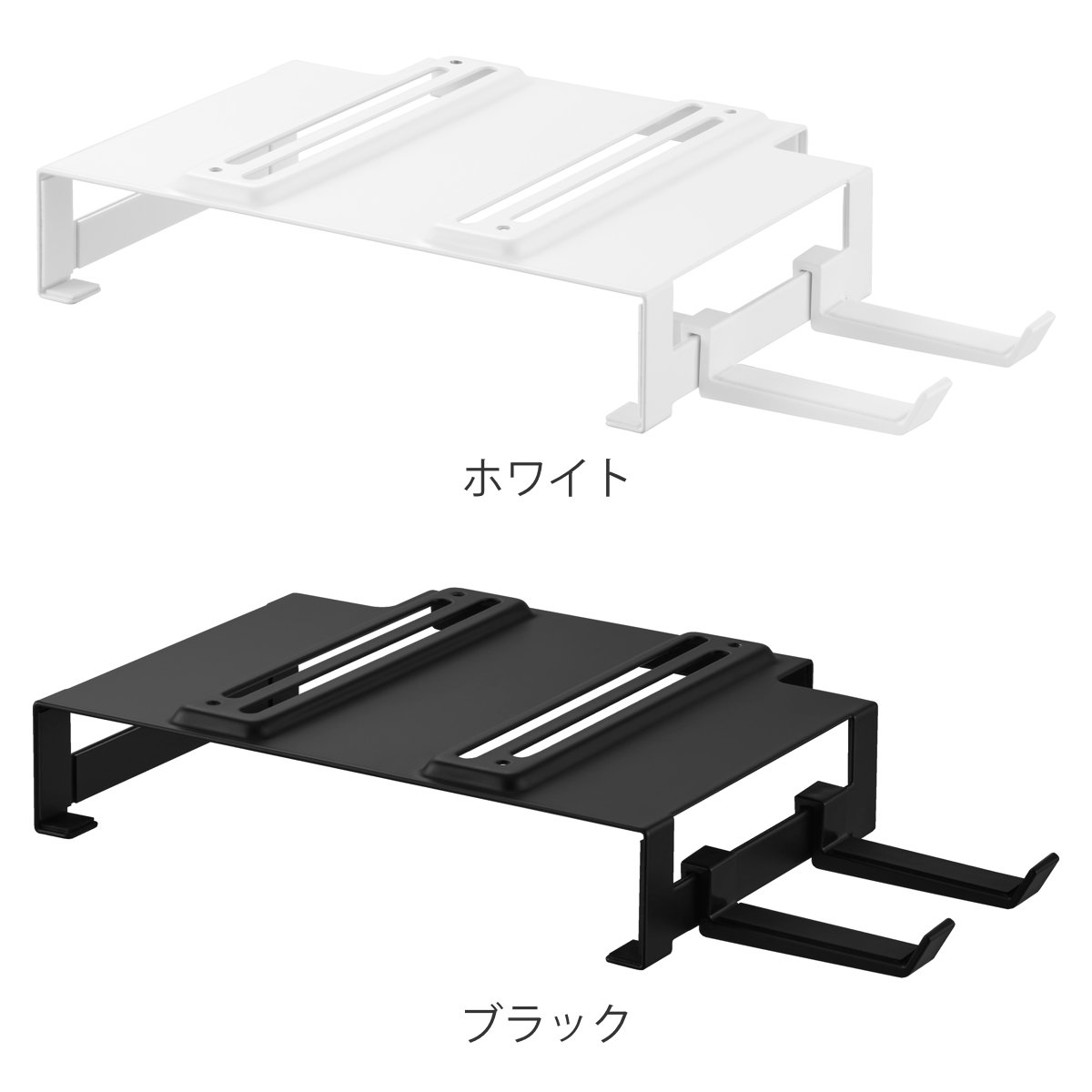 ラックを縦横どちらの向きに設置しても、取り付け可能なロングフックが2個付属しており、掃除道具やヘッドホンの収納に便利です。