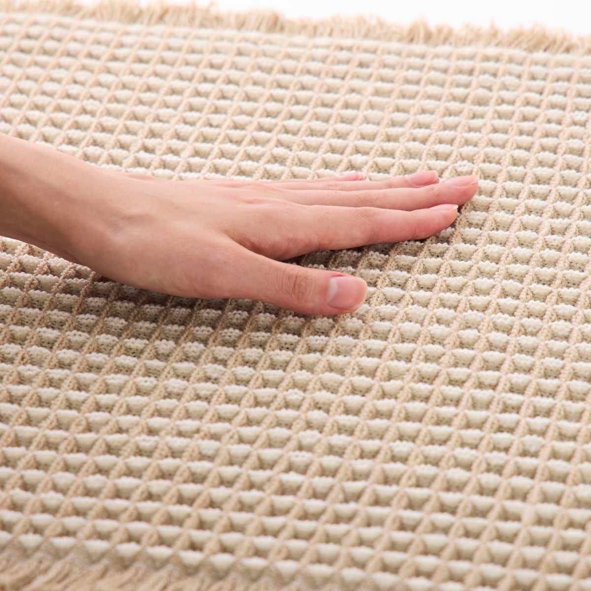 表面に四角い凹凸を施した厚手のマットで、インテリアに自然と馴染むデザインです。ふわふわの踏み心地が心地よく、毎日の足元を快適にしてくれます。