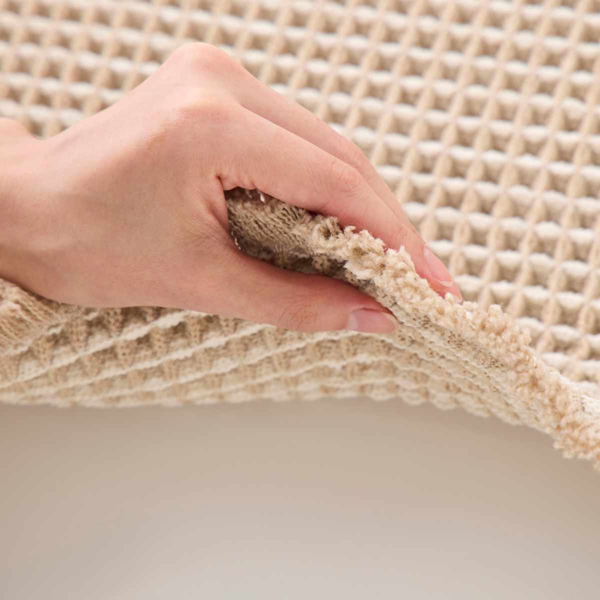厚さ約1cmの厚手ワッフル織りで、踏んでも弾力がありへたりにくい仕様です。立体的な凹凸が空気の層をつくり、通気性が良く水滴も素早く吸収。キッチン使いにぴったりの快適なマットです。