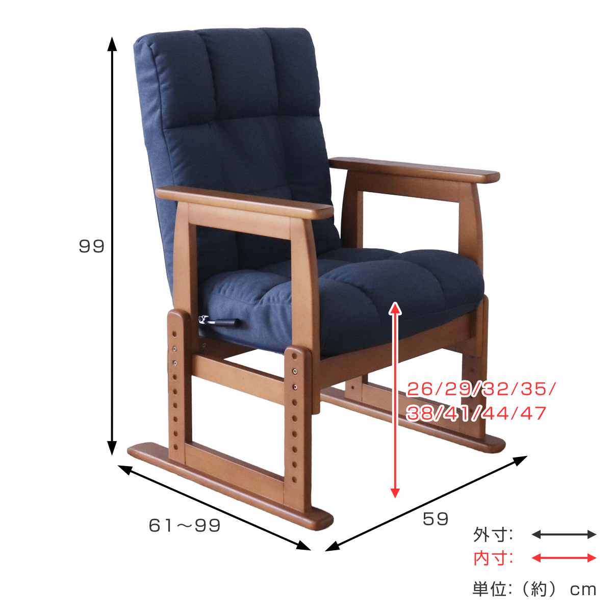 | サイズ | 約 幅59×奥行61~99×高さ99(cm) 座面高:26/29/32/35/38/41/44/47(cm) |
