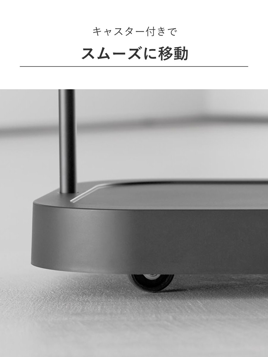 台座後方にはキャスターを備え、ゴミ捨てや回収時、床掃除の際などに軽く持ち上げるだけでスムーズに移動可能。重くなっても動かしやすく、設置場所の調整や模様替え時にも便利です。