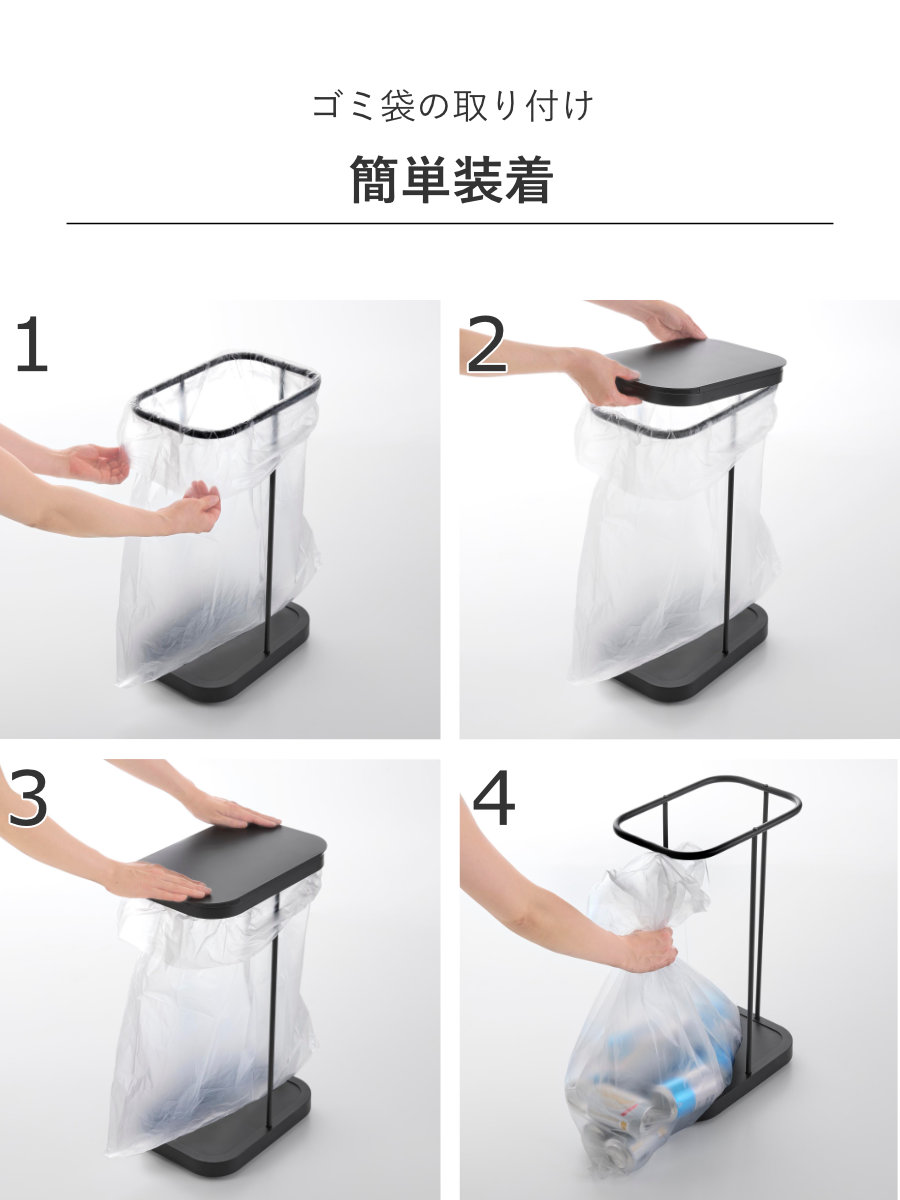 ゴミ袋の取り付けは、袋を掛けてフタをするだけの簡単仕様。交換時も、フタを外して手前から引き抜くだけなので、手間をかけずスムーズに行えます。日常的なゴミ捨て作業をラクにする、使いやすさを追求した設計です。