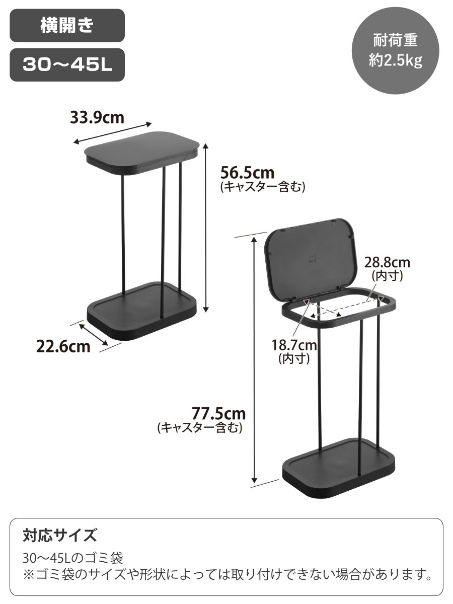 | 対応サイズ | 30~45Lのゴミ袋 ※ゴミ袋のサイズや形状によっては取り付けできない場合があります。 |