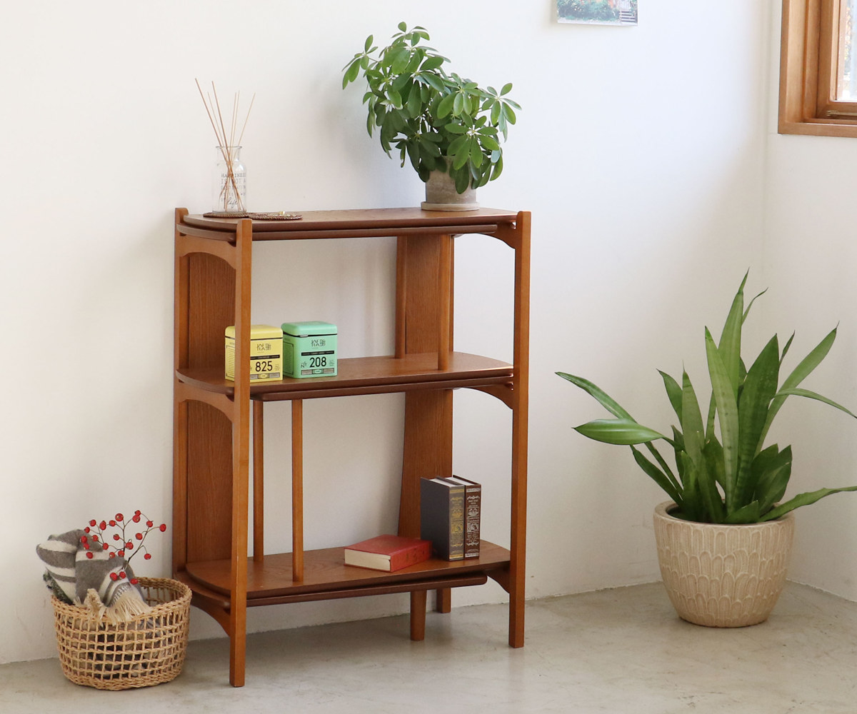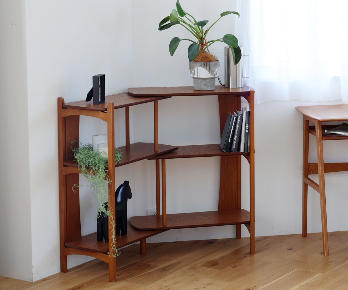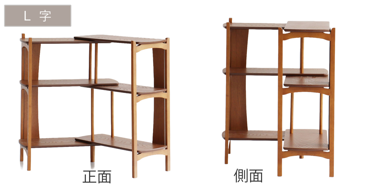 棚板は優しい曲線を描く樽型形状です。フレームや桟(さん)は、直線と曲線を組合せ、シンプルながらも個性のある佇まいです。