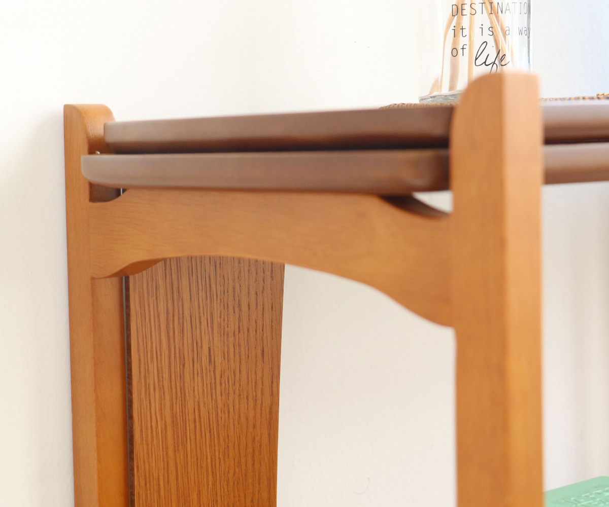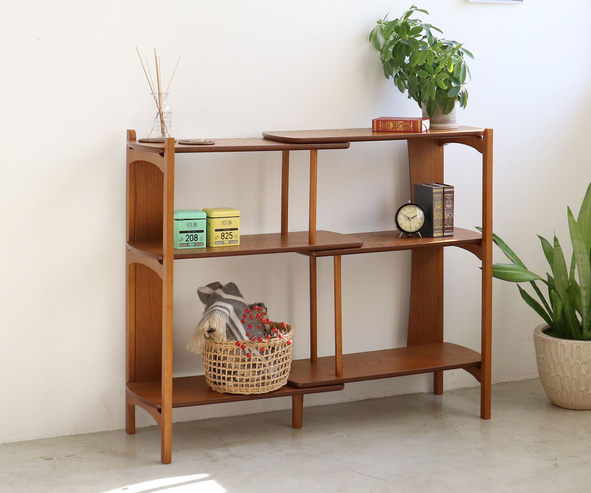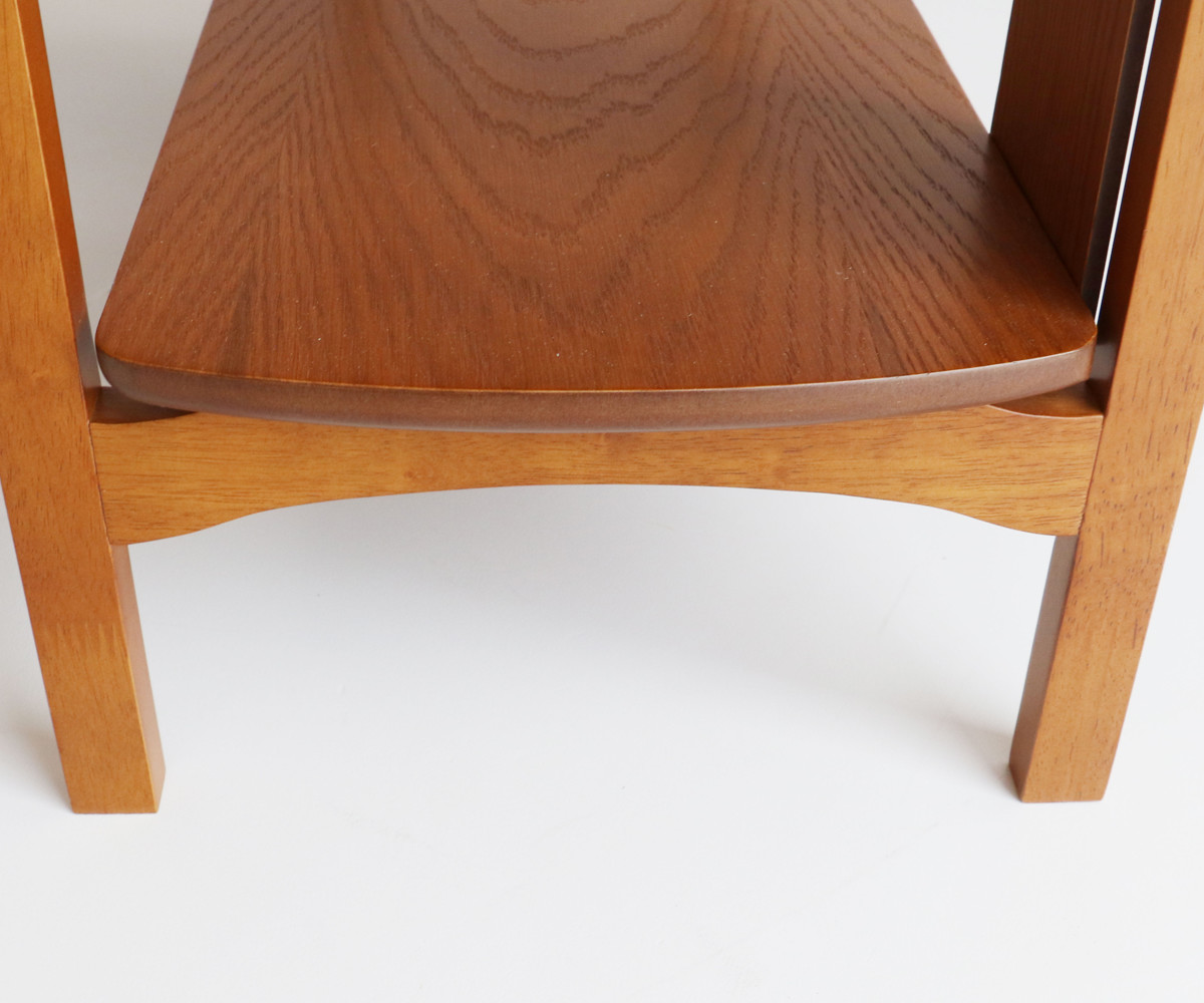 棚板は優しい曲線を描く樽型形状です。フレームや桟(さん)は、直線と曲線を組合せ、シンプルながらも個性のある佇まいです。