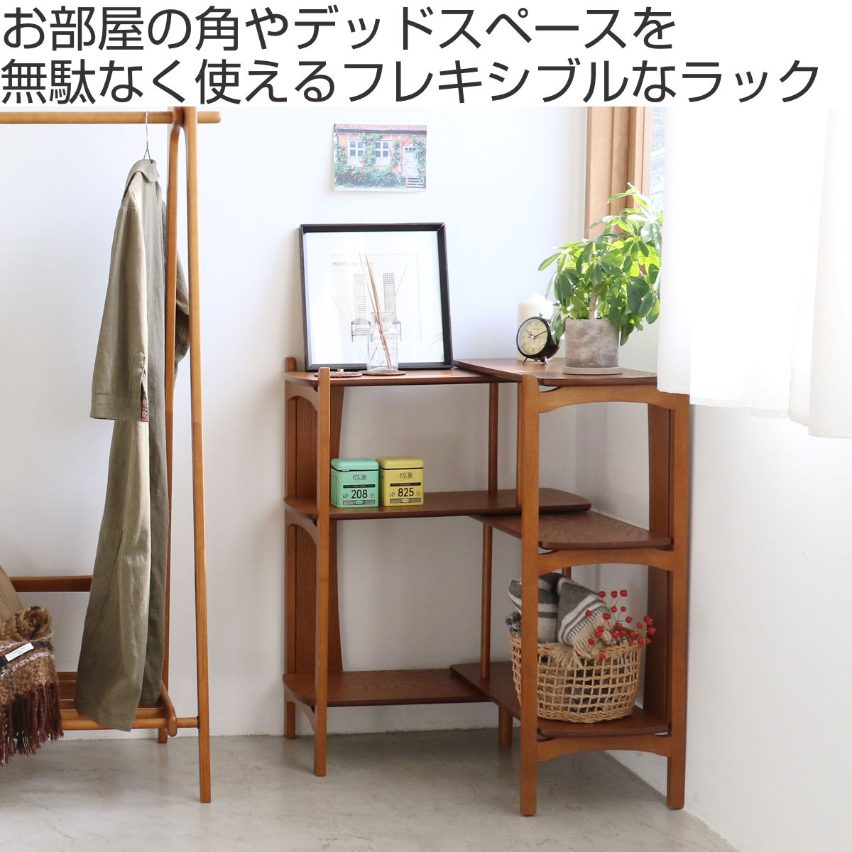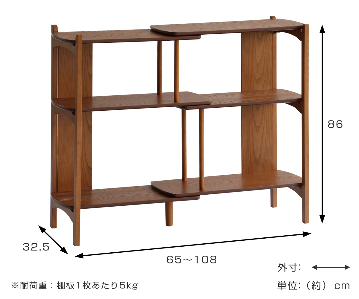 設置するスペースや用途に応じて、幅65~108cmまで伸縮するオープンラックです。L字型にレイアウトすることも可能なので、お部屋の角やデッドスペースも無駄なく活用できます。