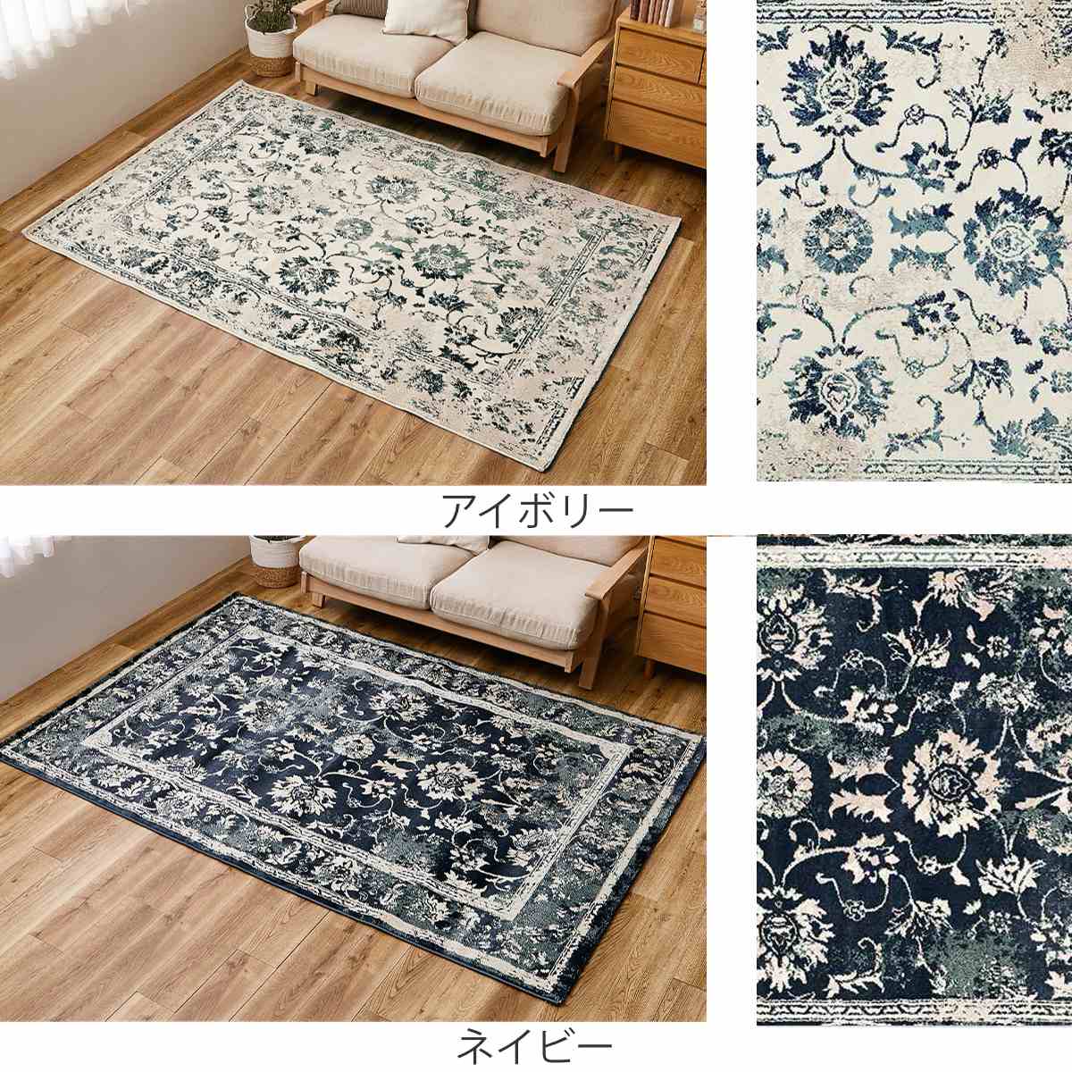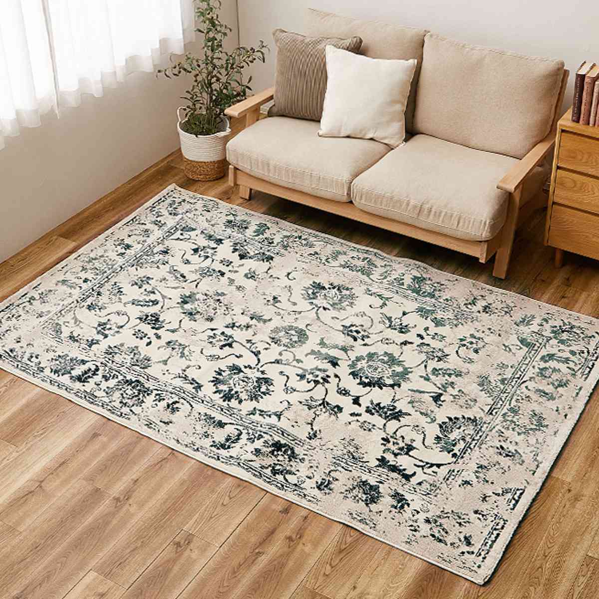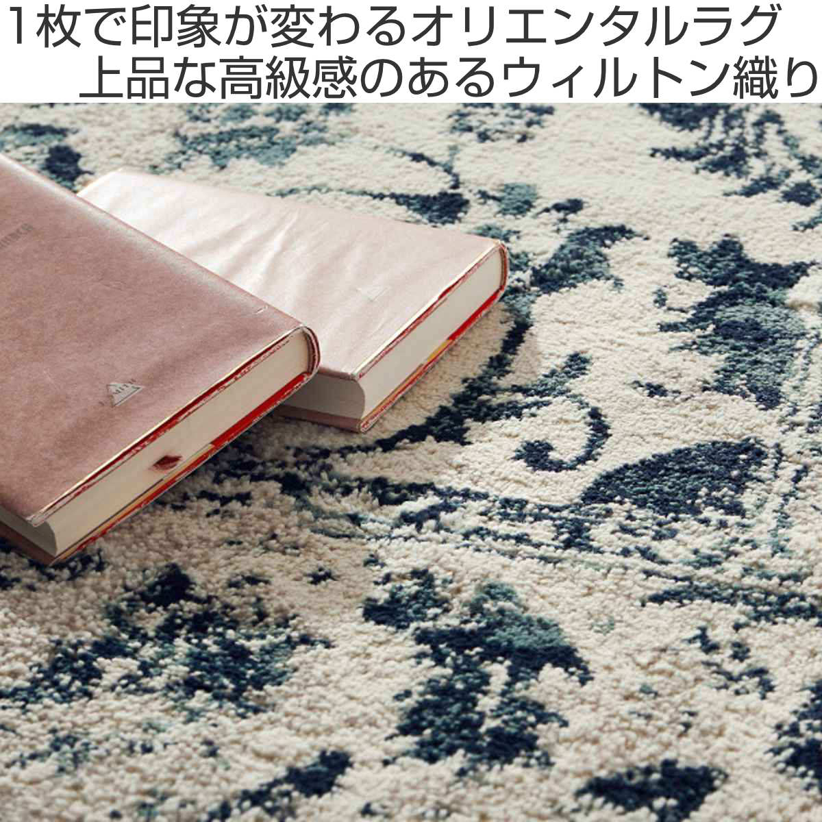 アラベスク調の細かな模様と、ヴィンテージのようなかすれを織りで表現したウィルトン織ラグです。オリエンタルな雰囲気が魅力で、空間に上品さと高級感を添えてくれます。